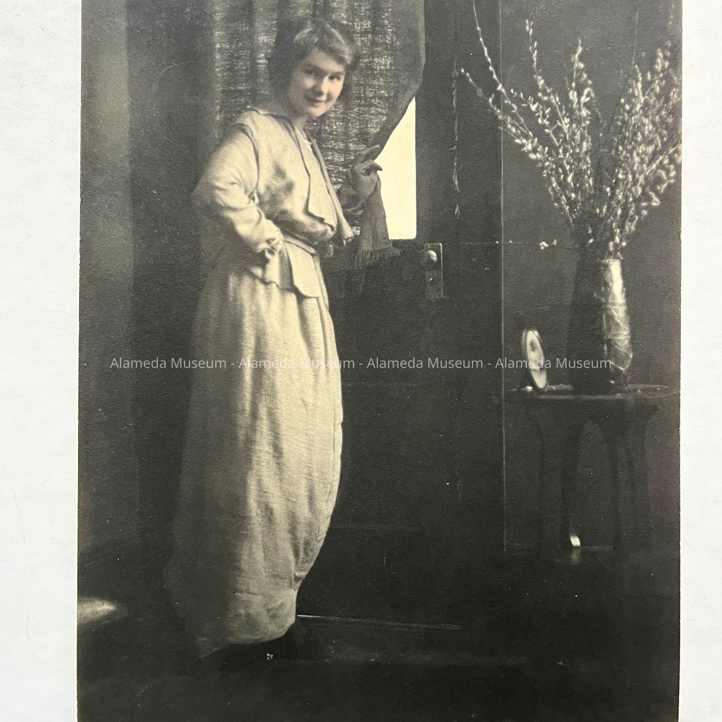 History of Object: (Self ?) portrait of Wanda Stolte, Alameda photographer, standing indoors by a door.