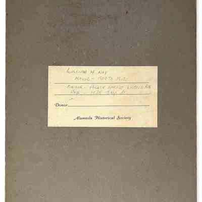 Description: Lt. sepia-toned black/white photo mounted on grey paperboard with a printed blue/grey border along the edge of the outer margin, and another surrounding the image, itself. Photographer: Dejoiner, Alameda. Old cataloging label is affixed to the upper right corner of the mounting and a typed description label is attached below the image. Nail holes are in all corners.