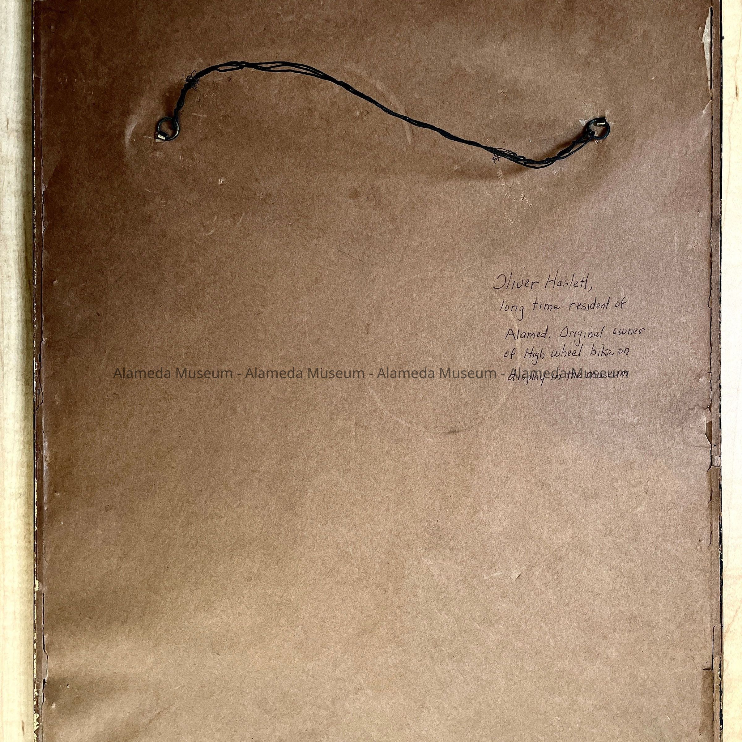HISTORY OF OBJECT: Portrait of Oliver Haslett, father of Kathleen Edwards, and member of a pioneer Alameda family. Oliver was the original owner of the ordinary (high wheel) bicycle now in the museum collection (1984 collection).
