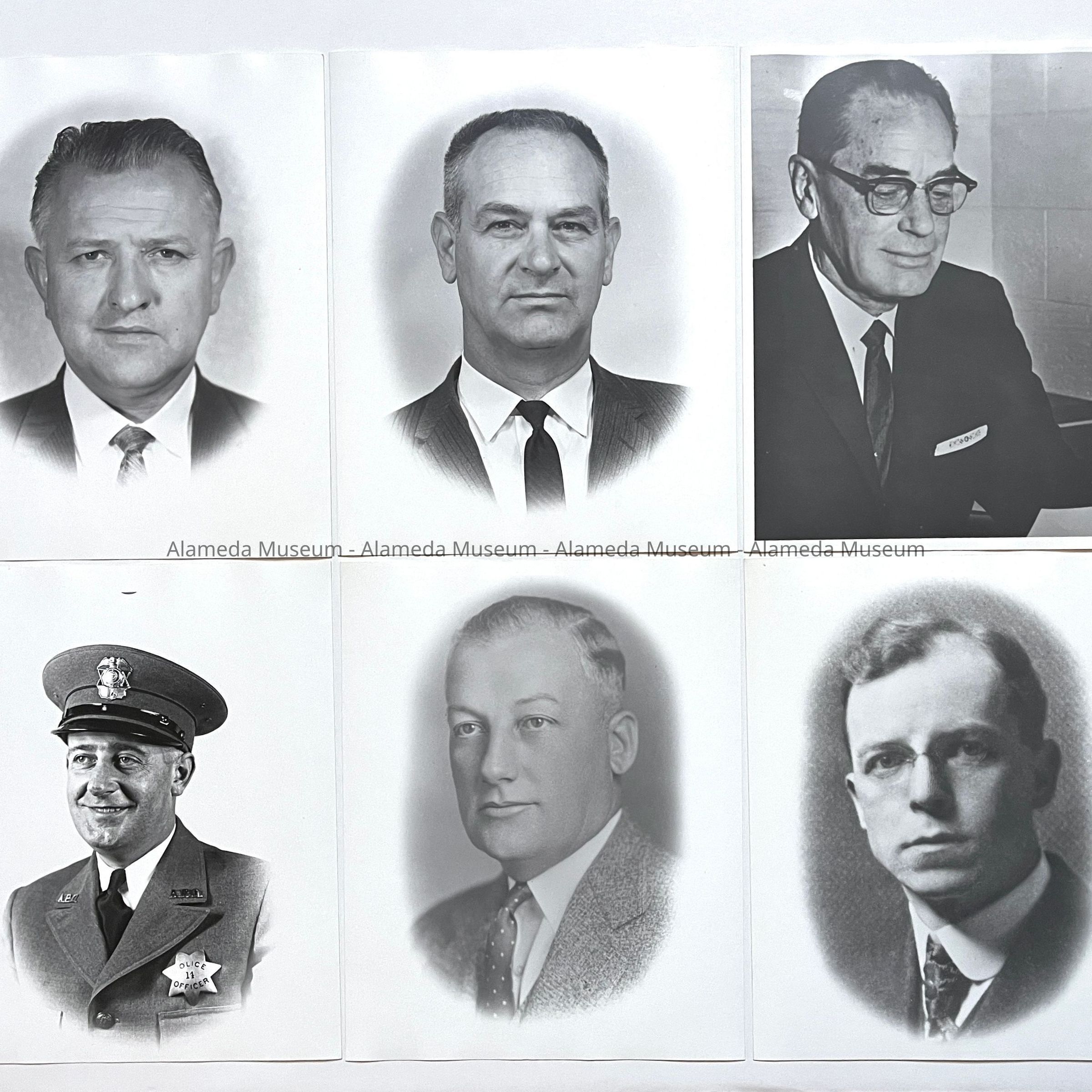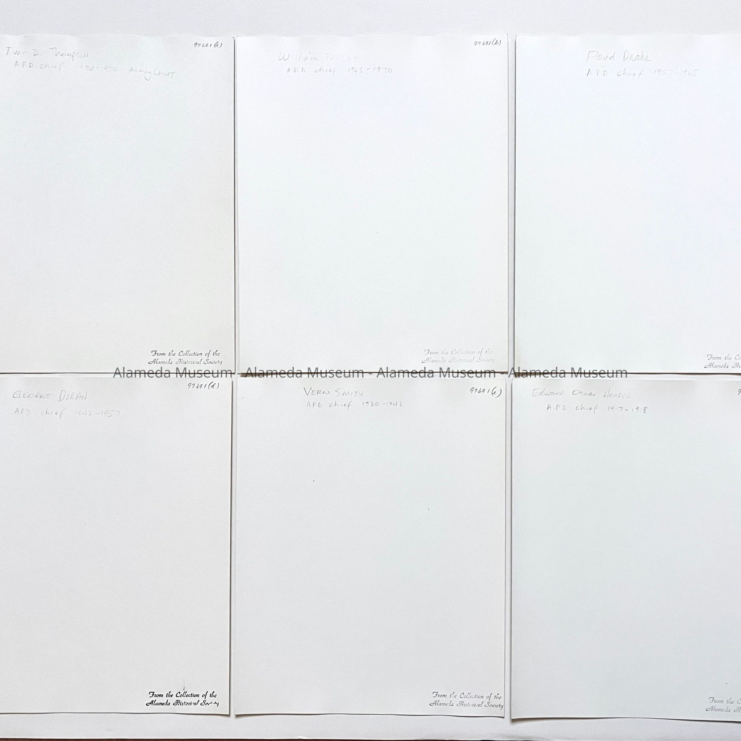 History of Object: Formal portraits of various Alameda Police Chiefs: a) Ivan D. Thompson (acting): 1970; b) Wm. Tulloh: 1965-1970; c) Floyd Drake: 1957–1965; d) George Doran: 1942–1957; e) Vern Smith: 1930–1942; f) Edward Oscar Heinrich: 1917-1918.