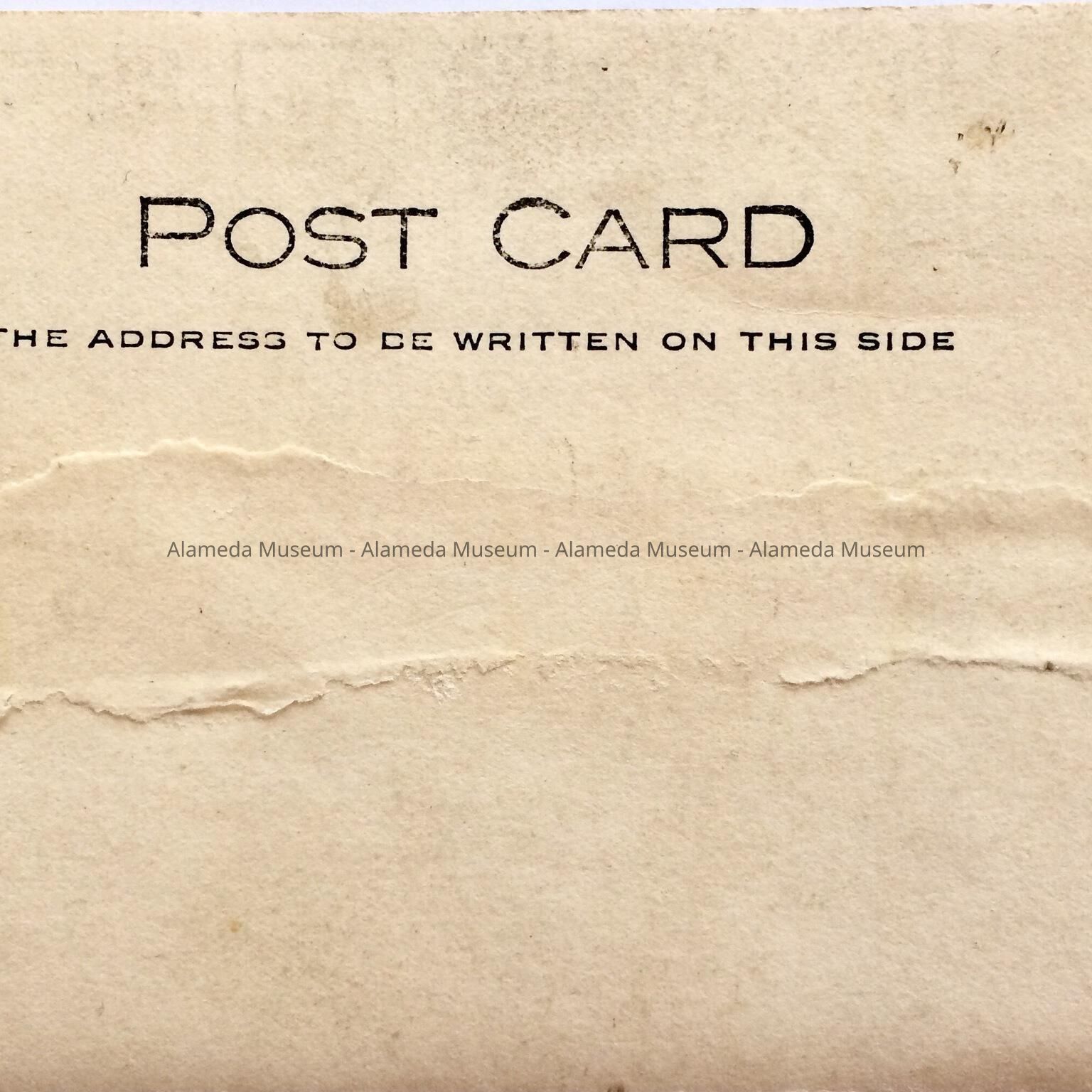 History of Object: Photographic postcard depicting the exterior (main facade) of 1409 Caroline Street, Alameda. The house was rented by the donor's parents who had left San Francisco following the earthquake & fire of 1906. It was here that the donor (Helene Ames) was born in 1907. Pictured in front of the house is Harding (changed to Robert) Ames (born S.F.-1900) brother of Helene.