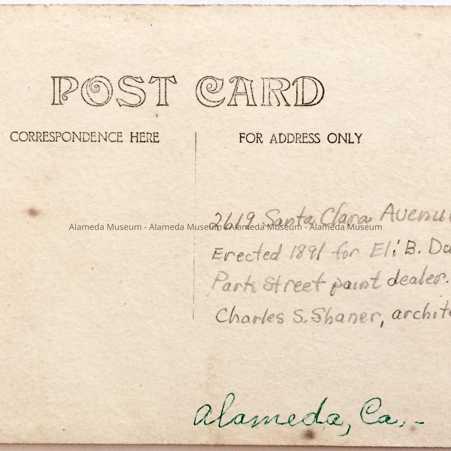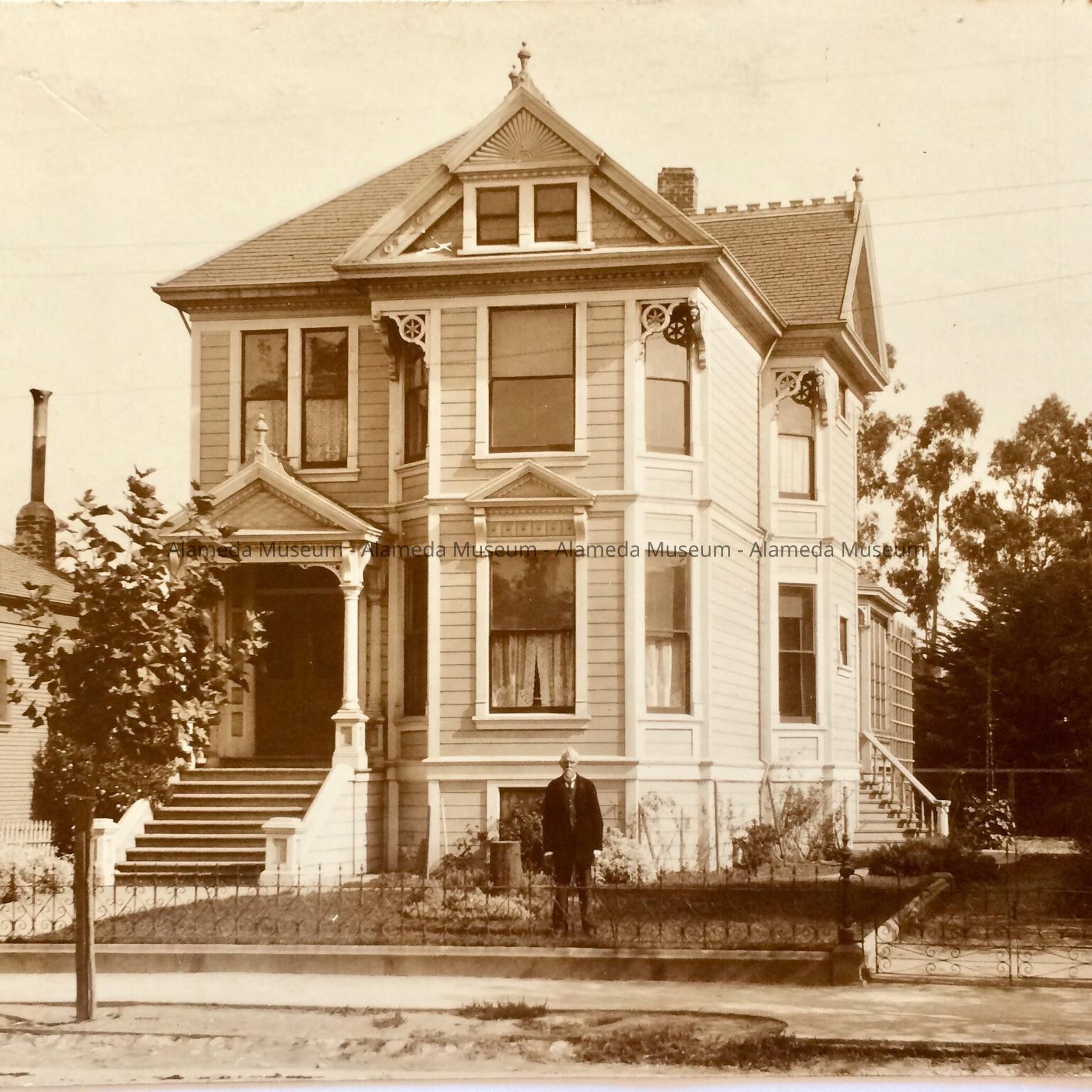 Photographic postcard depicting exterior of 2619 Santa Clara Ave., erected 1891. The original owner Eli B. Dunning, Park Street Paint dealer is pictured in front of his home. Charles S. Shaner, Architect.