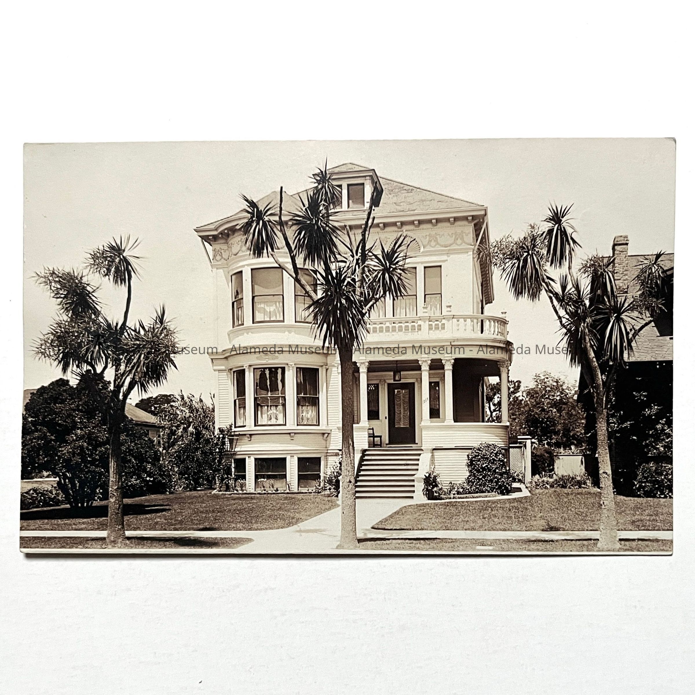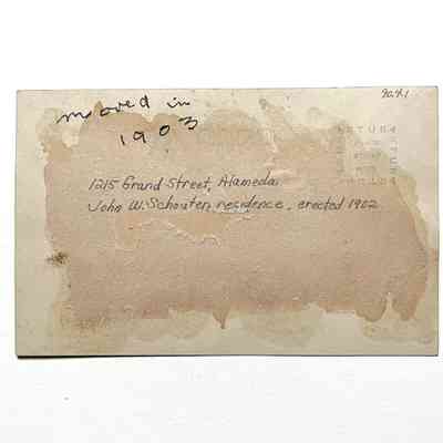 Photographic postcard depicting the main facade of 1215 Grand Street, Alameda. The home, in the Colonial Revival style, was erected in 1902 for John W. Schouten, lumber dealer, San Francisco.