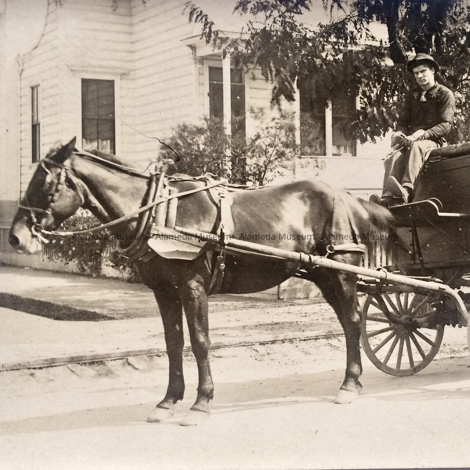 Photographic postcard depicting horse drawn wagon (driver's identity unknown), taken in an unknown location in Alameda, Ca.