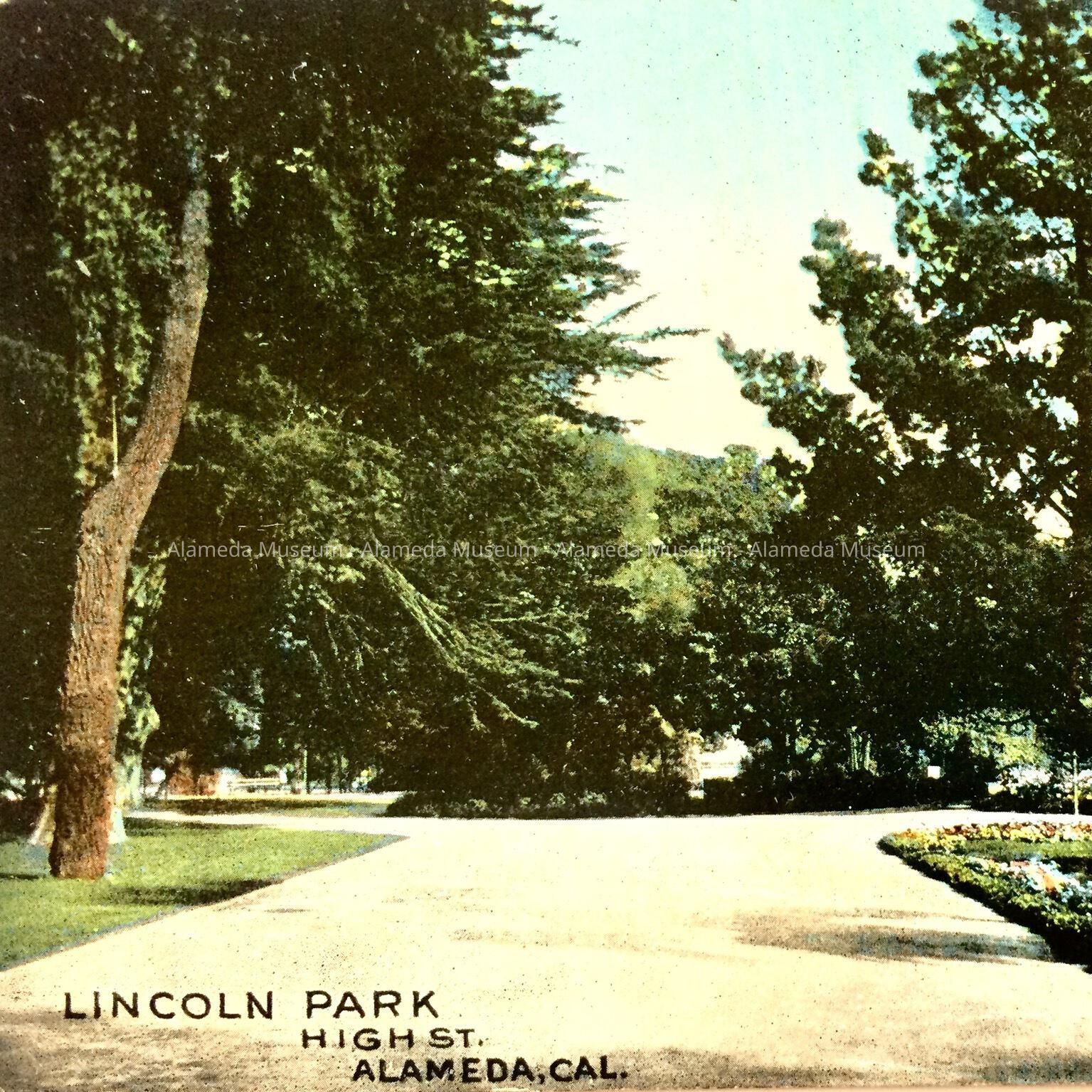 History of Object: Post card illustrating Lincoln Park, High street, Alameda, 1915. The statues of the Thompson Estate are still evident in this early view.