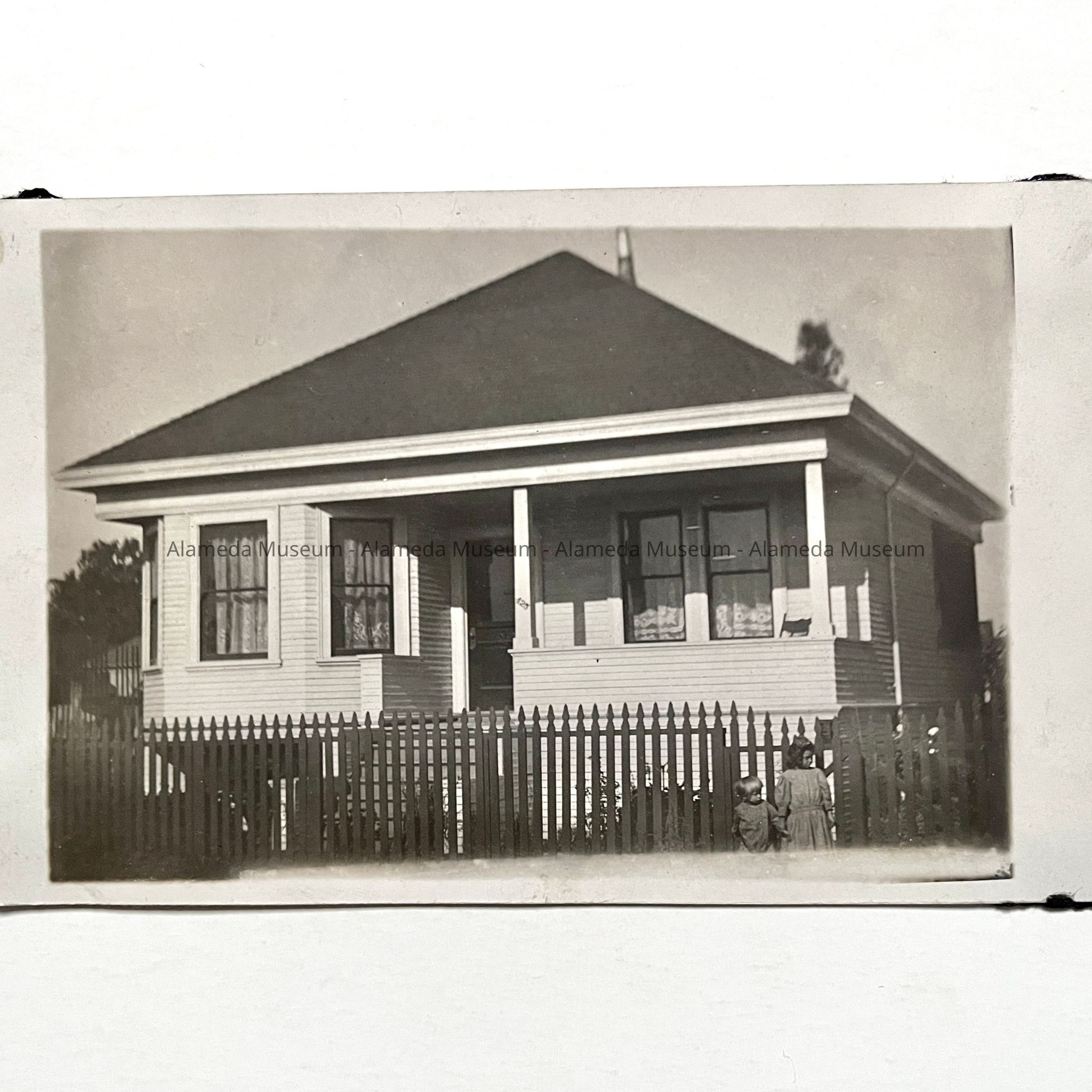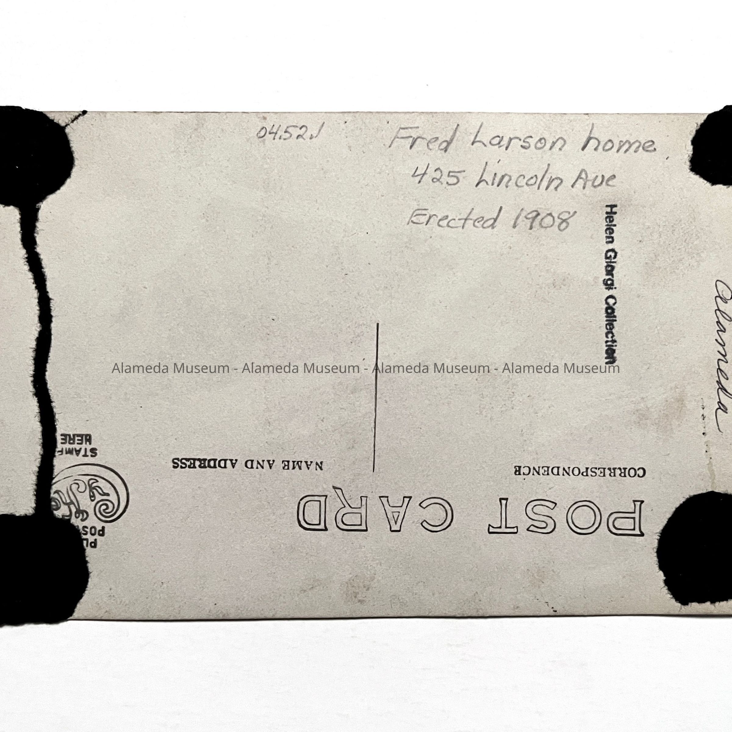 HISTORY OF OBJECT: A PHOTOGRAPHIC POSTCARD DEPICTING THE MAIN FACADE OF THE FRED LARSON HOME AT 425 LINCOLN AVENUE, ALAMEDA. ERECTED IN 1908.
