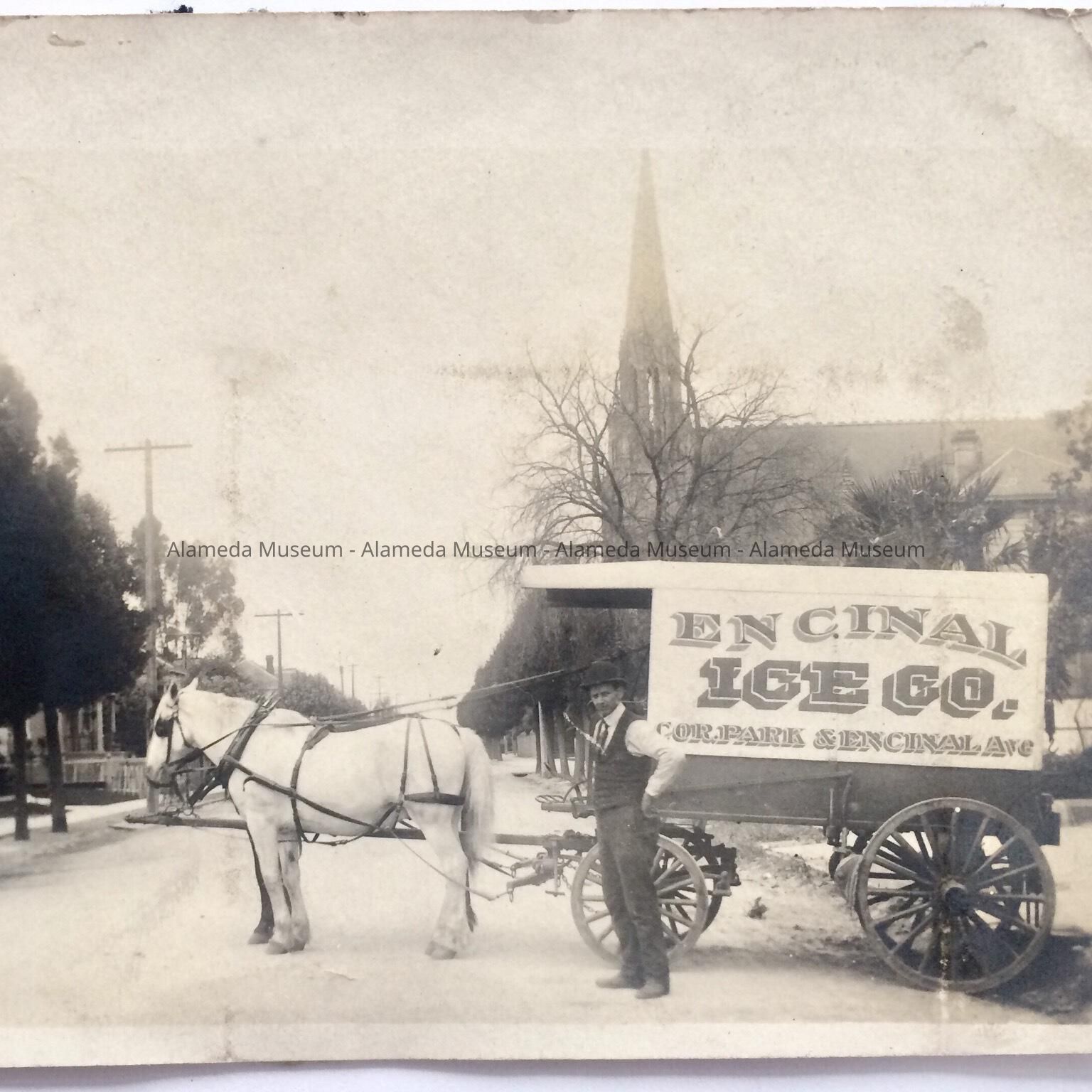 History of Object: Photographic postcard depicting the delivery wagon of the Encinal Ice Company, corner Park Street & Encinal Avenue. The photo was taken on San Antonio Avenue looking toward the old St. Joseph's Church (destroyed by fire in 1919).