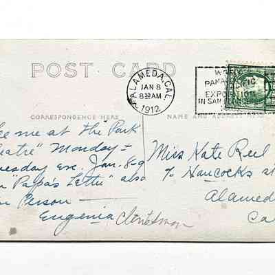 History: Photographic portrait postcard of the child actress Eugenia Clinchard. The card is addressed to Kate Reed c/o Hancock's Store (corner Encinal Avenue and High Street), Alameda, CA. The message states "See me at the Park Theater Monday in Papa's Letter".