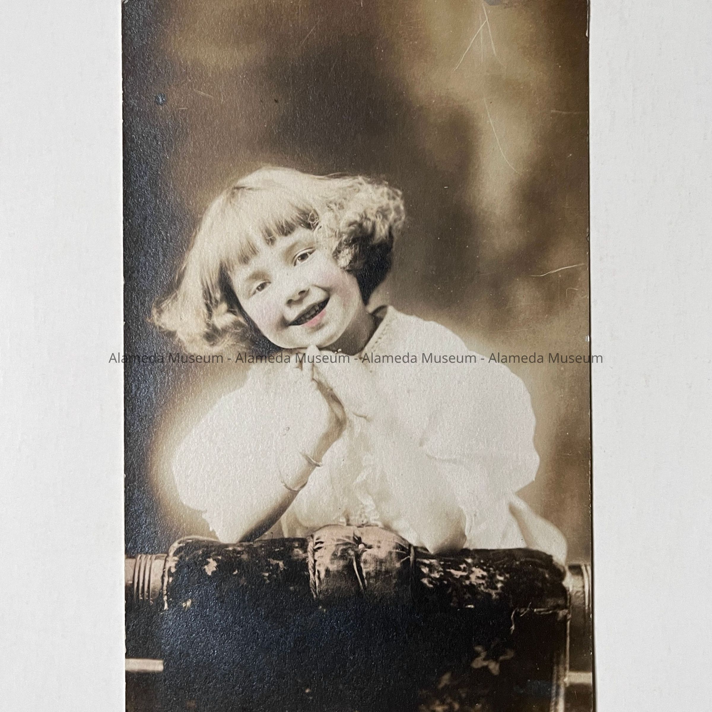Description: Sepia tinted photographic postcard with a child's portrait. Reverse side has address, personal message and is postmarked Alameda, CA, January 8, 1912.