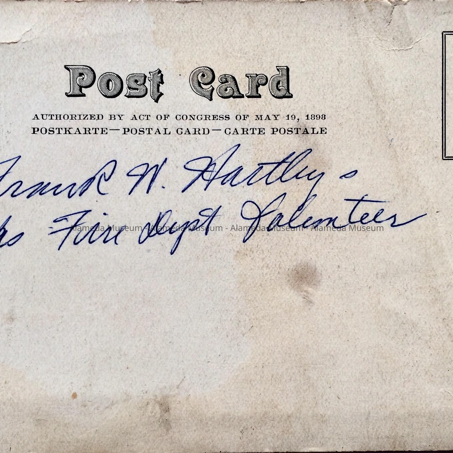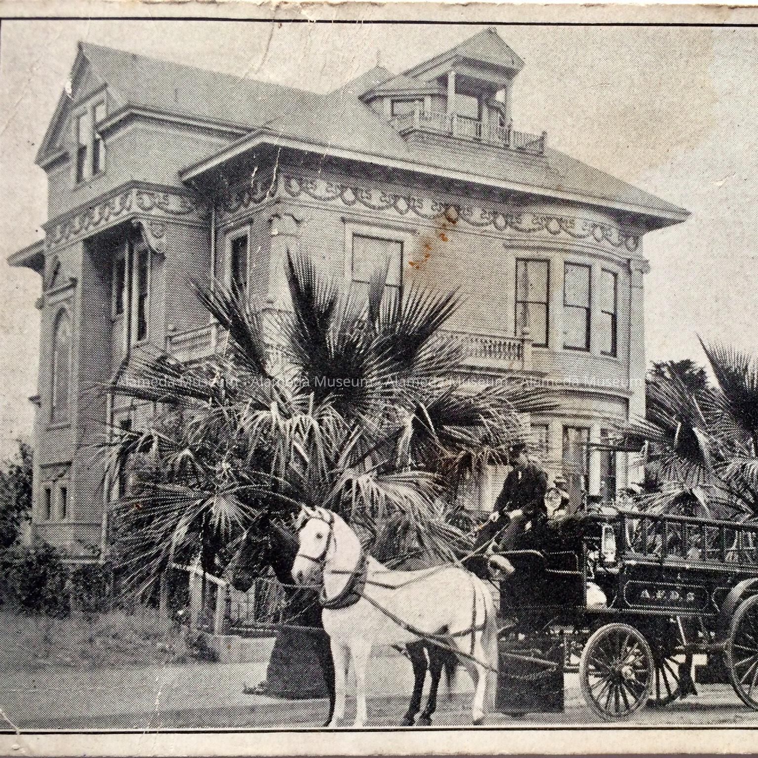 History of Object: Postcard depicting the donor’s father, Frank W. Hartley, in uniform, as driver of a horse drawn hook & ladder truck, Alameda Fire Department, in front of the Henry Sevening mansion, Central Ave. & Everett Street, Alameda.