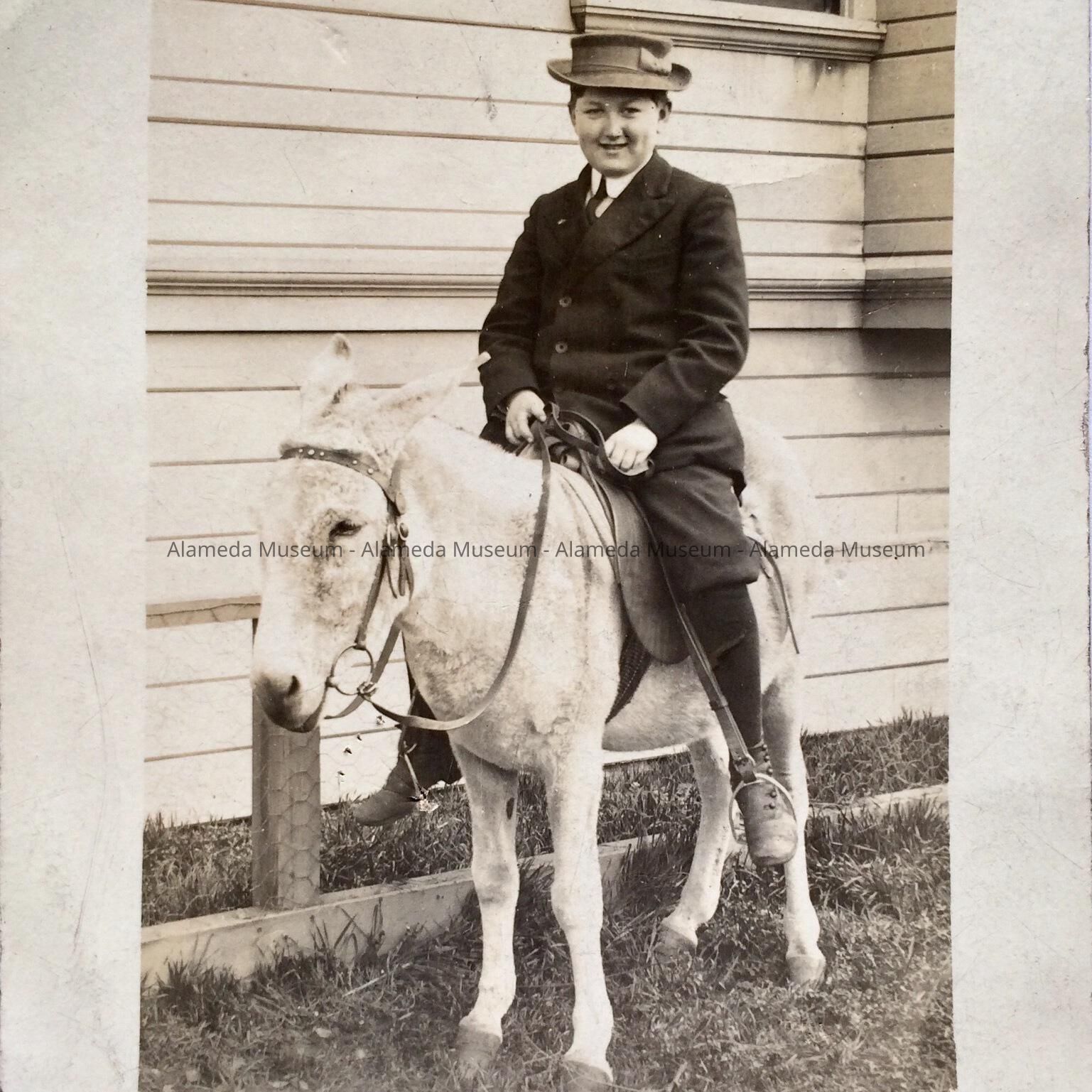 A PHOTOGRAPHIC POSTCARD DEPICTING ROBERT AMES ASTRIDE A DONKEY. HE WAS A LIFELONG RESIDENT OF THE CITY OF ALAMEDA.