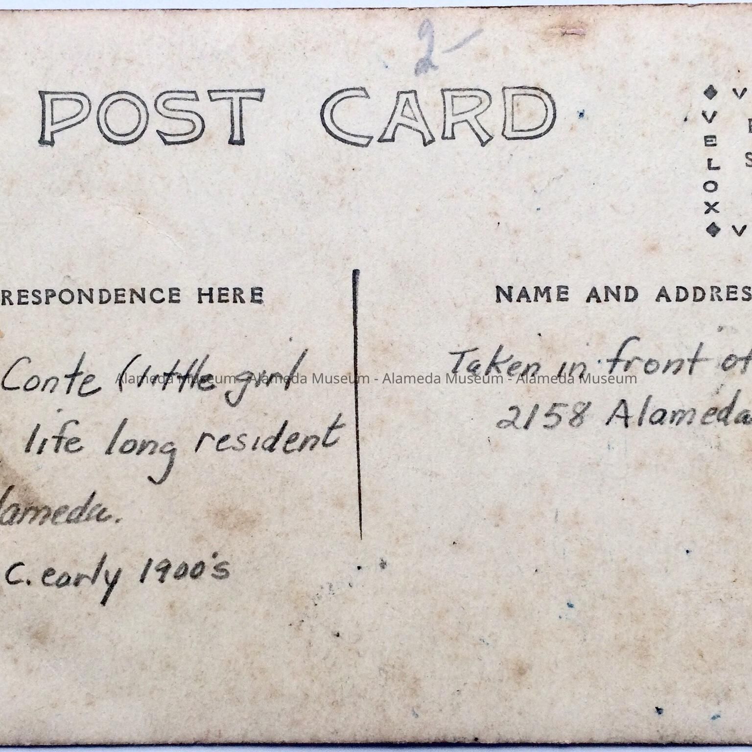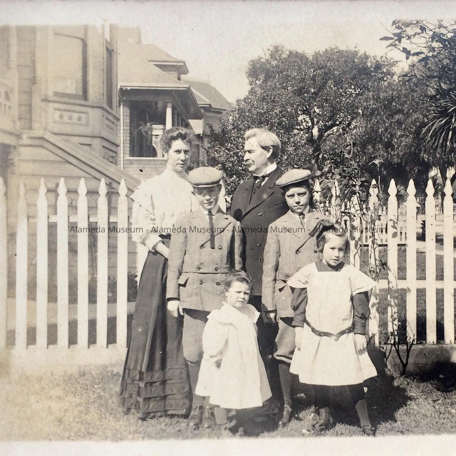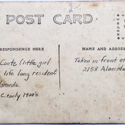 Photographic postcard of the Blanc family in front of their house at 2158 Alameda Avenue. Included in the photograph is Lili Conte, a long-time resident of the city. Miss Conte was sent to live with her aunt Blanche Blanc at 2158 Alameda Avenue following the earthquake and fire in San Francisco in 1906. Her mother was killed during the disaster and her father sent her here to be raised. She attended Alameda High School and died in December, 1999. She married a Mr. Matson.