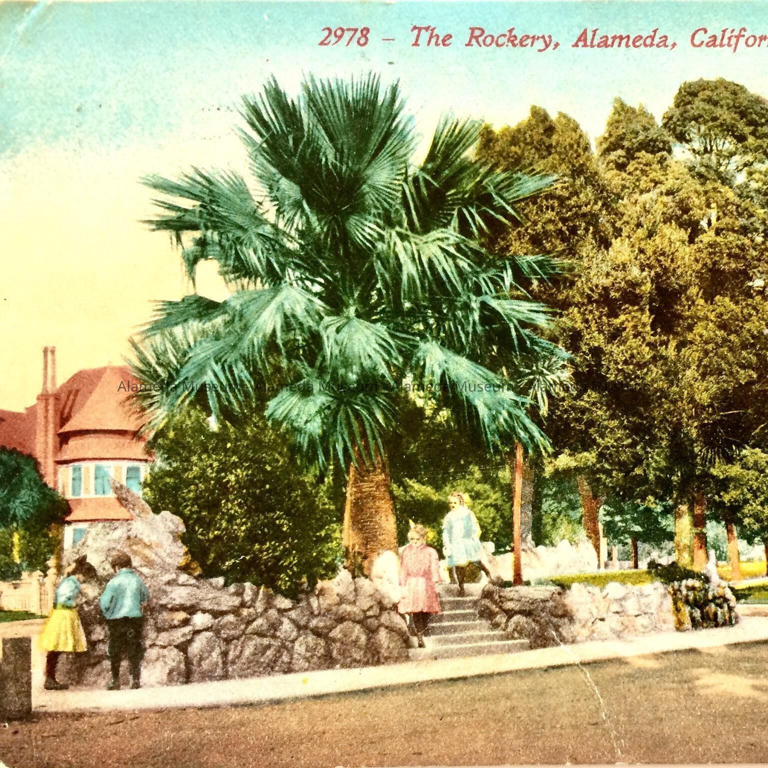 Postcard depicting a view of the Rockery, Alameda & Central Avenues, Alameda. Card dated 1912. Included in the scene is the Pond residence, gore of Alameda & Central Avenues, erected 1901, and now demolished.