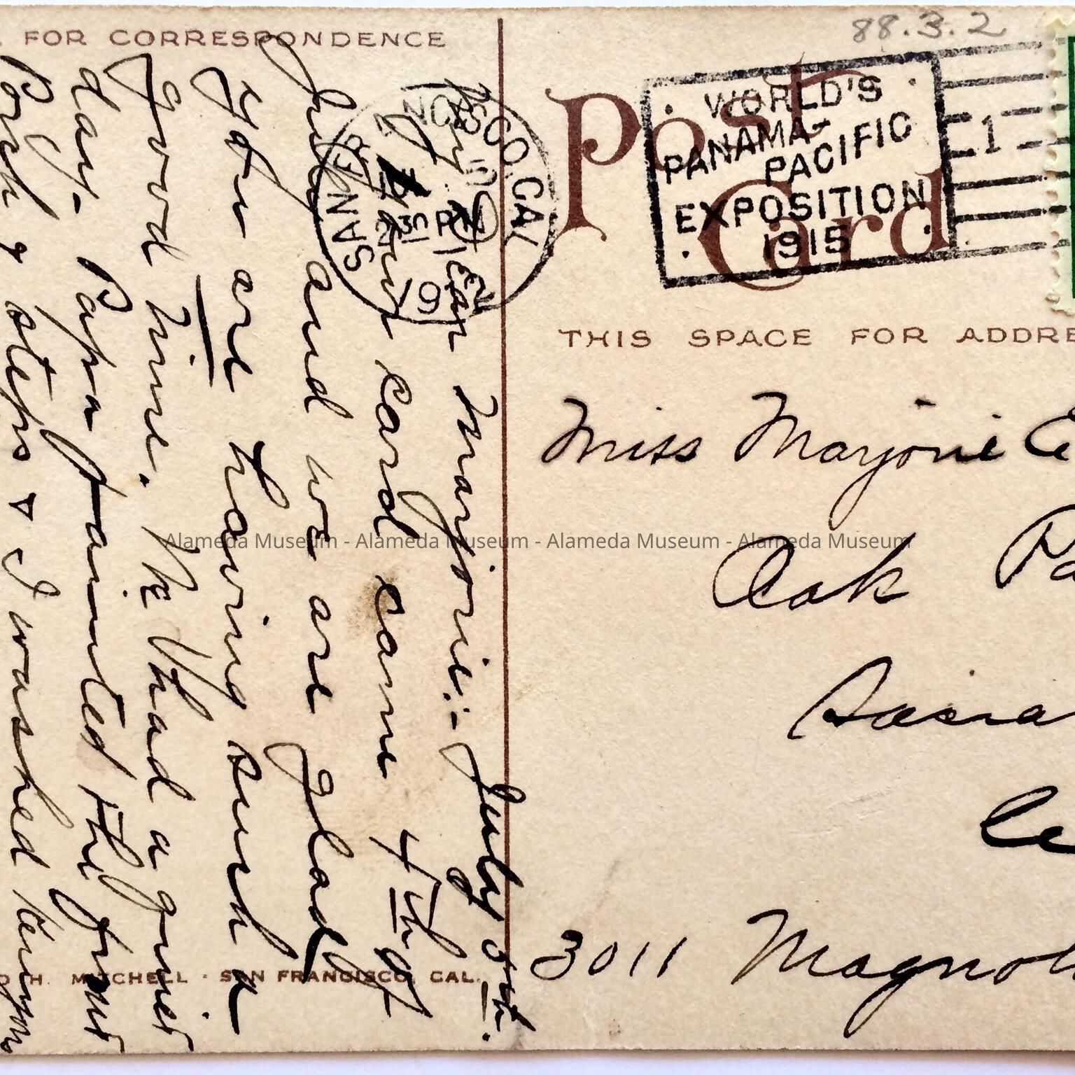 Description: Photo-lithographic postcard, signed on the reverse side "Edward H. Mitchell, S.F." Postmarked S.F., 1912. Size: L-3 1/2 x W-5 1/2 inches.