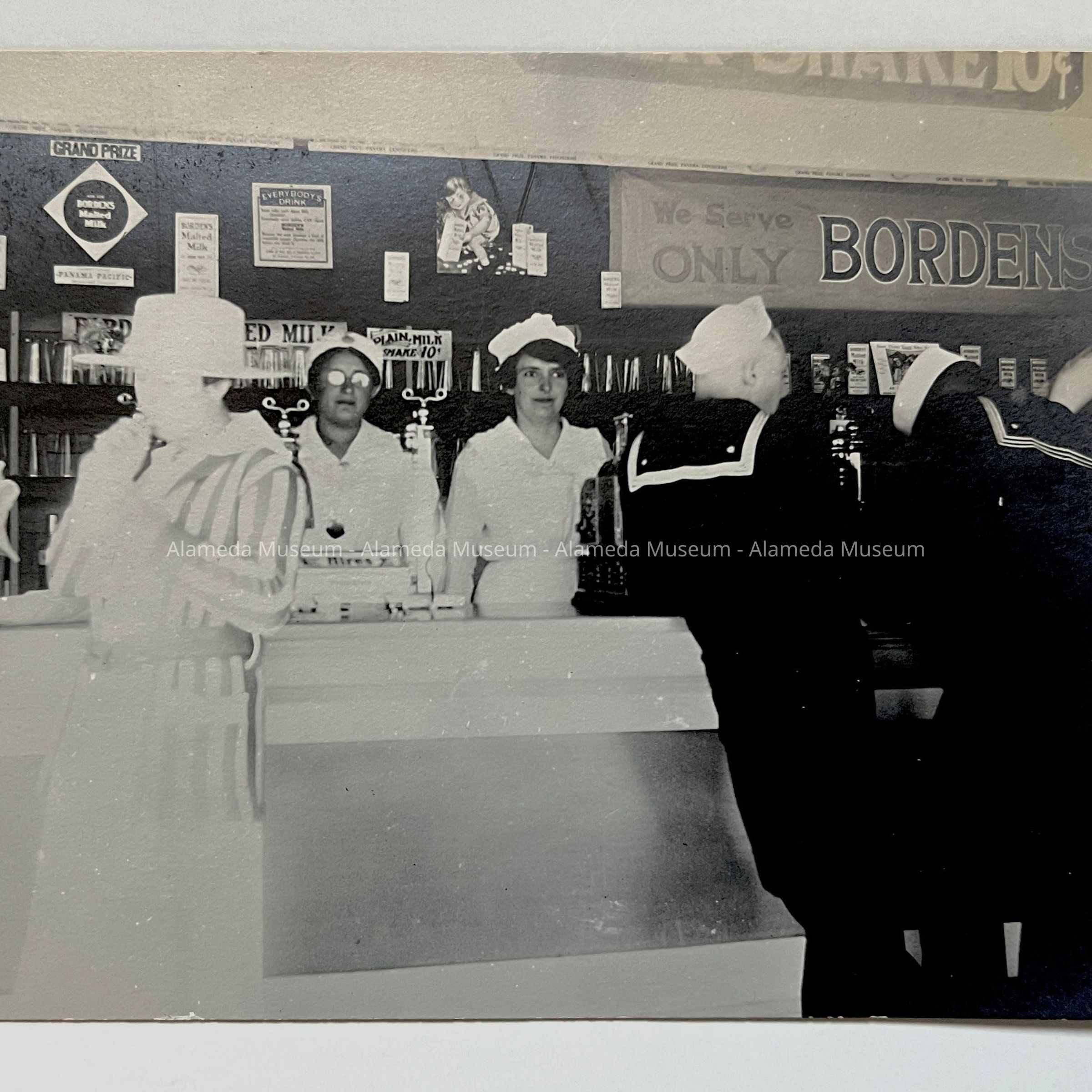 PHOTOGRAPHIC POSTCARD OF TWO WOMEN IN WAITRESS UNIFORMS BEHIND SODA FOUNTAIN COUNTER, NEPTUNE BEACH, ALAMEDA, CALIFORNIA, 1917.