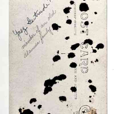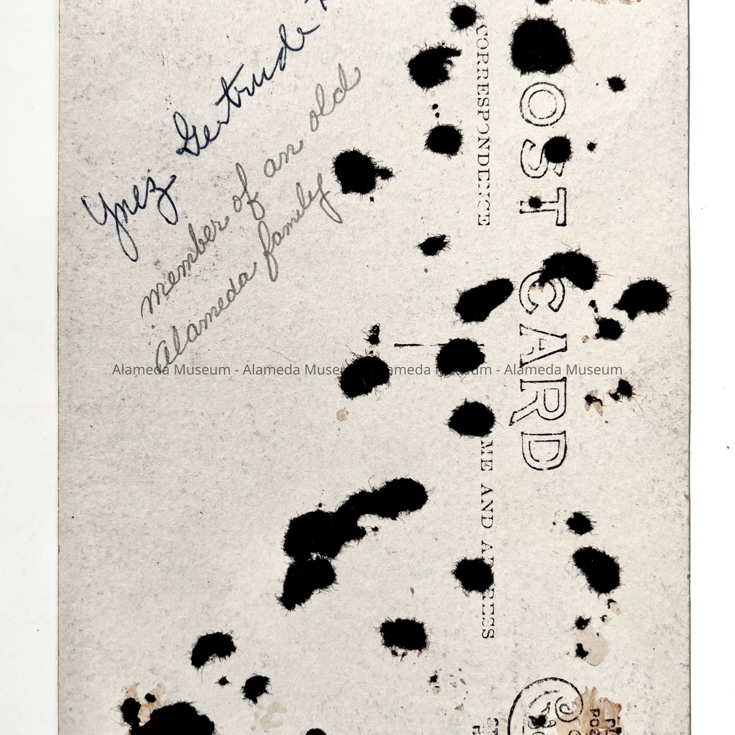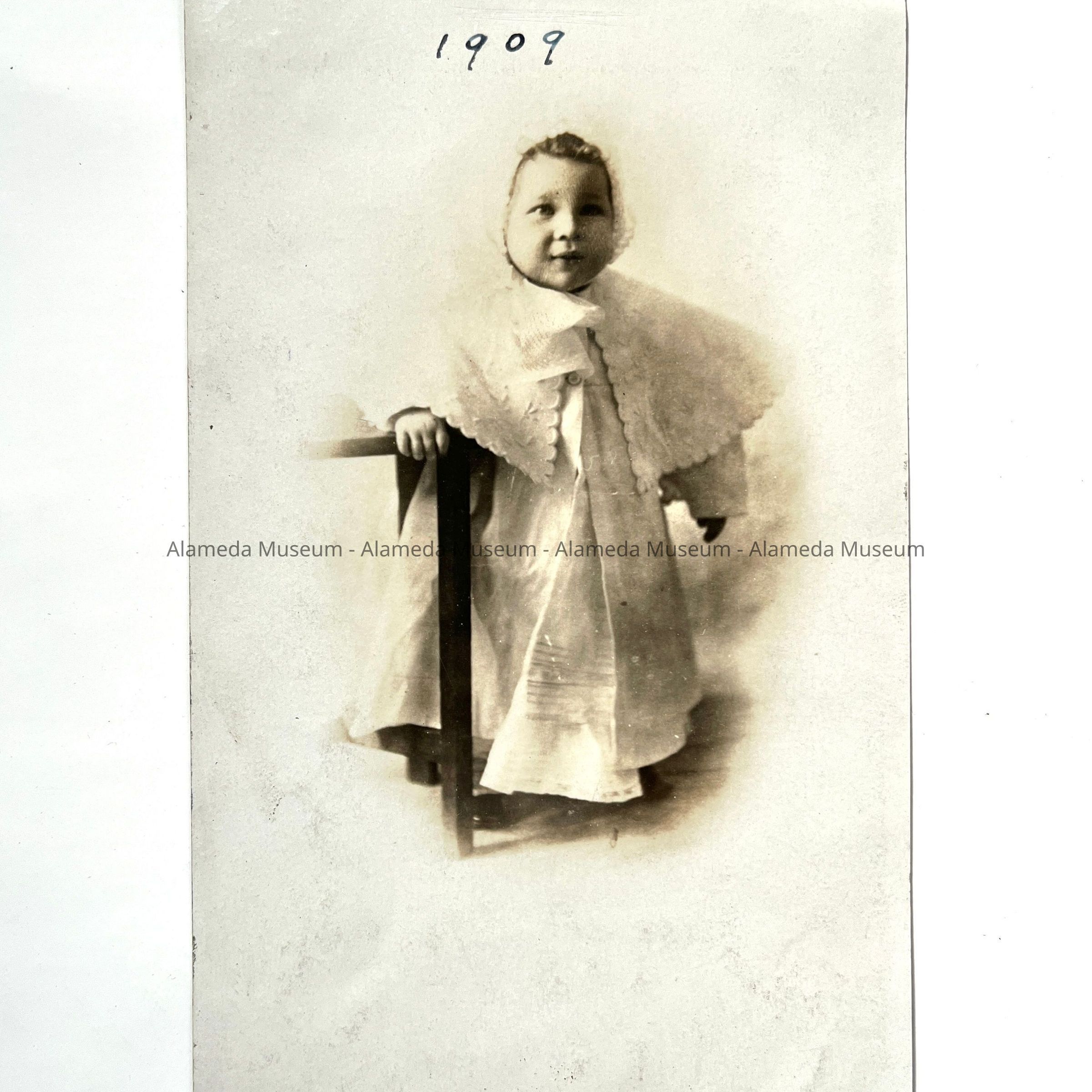 History of Object: Photographic postcard of Ynez Gertrude Koenig (2 years old), dated 1909. Miss. Koenig is a descendant of two early Alameda families.