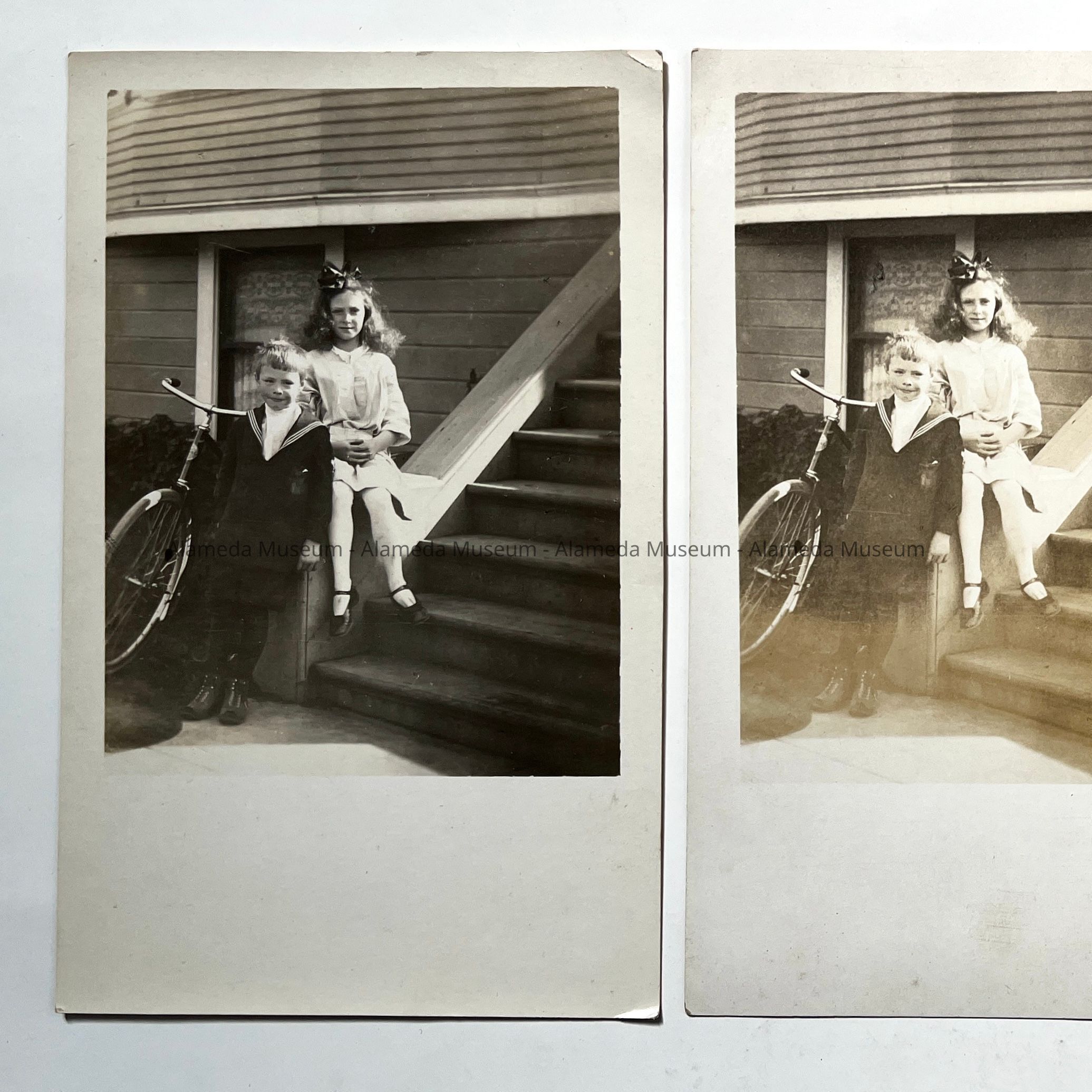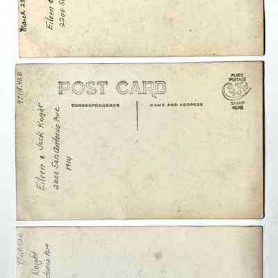 PHOTOGRAPHIC POSTCARDS OF EILEEN AND JACK KNIGHT, ON THE STEPS OF 2200 SAN ANTONIO AVENUE, ALAMEDA, CALIFORNIA.