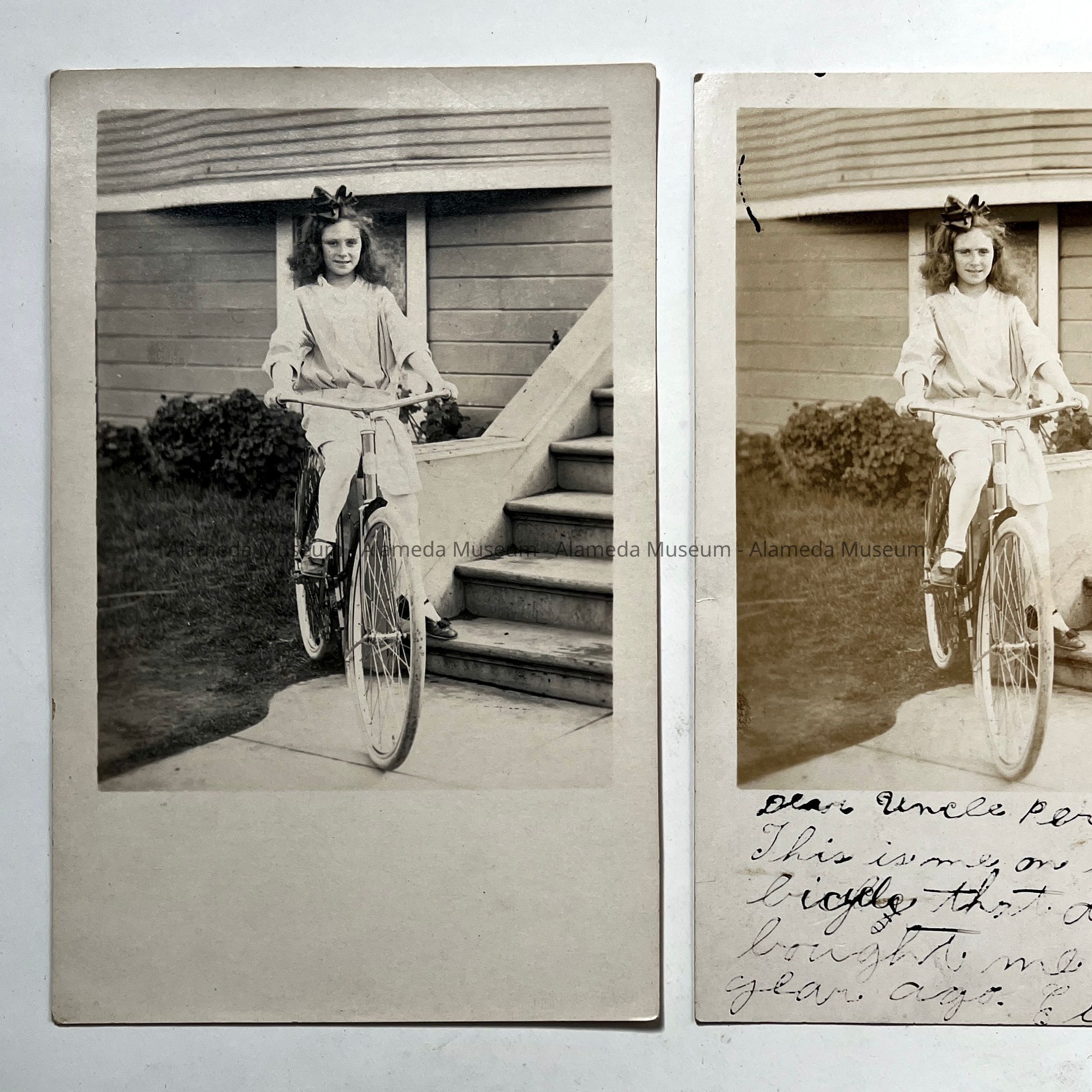 PHOTOGRAPHIC POSTCARDS OF EILEEN KNIGHT, PICTURED ON HER BICYCLE IN FRONT OF 2200 SAN ANTONIO AVENUE, ALAMEDA, CALIFORNIA.