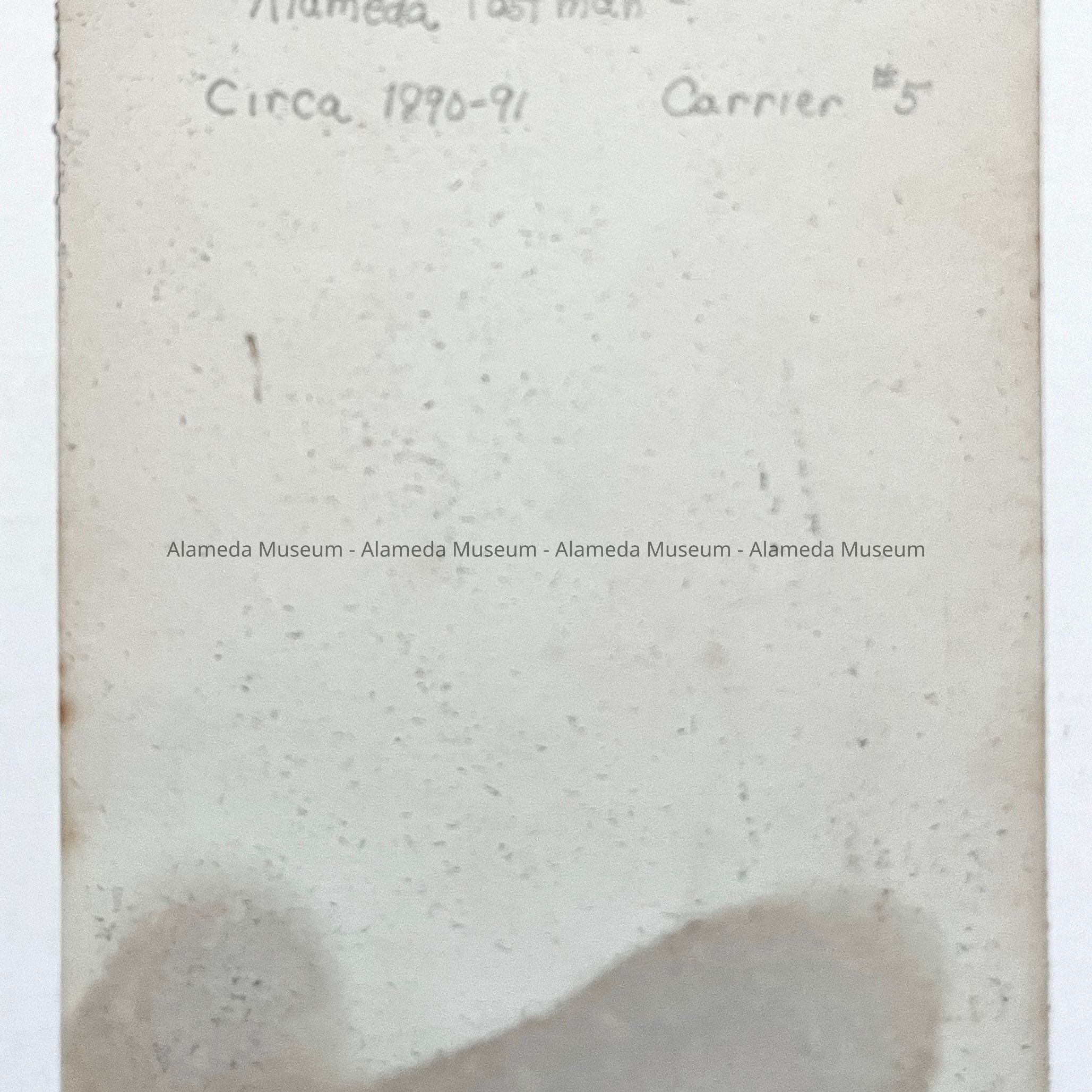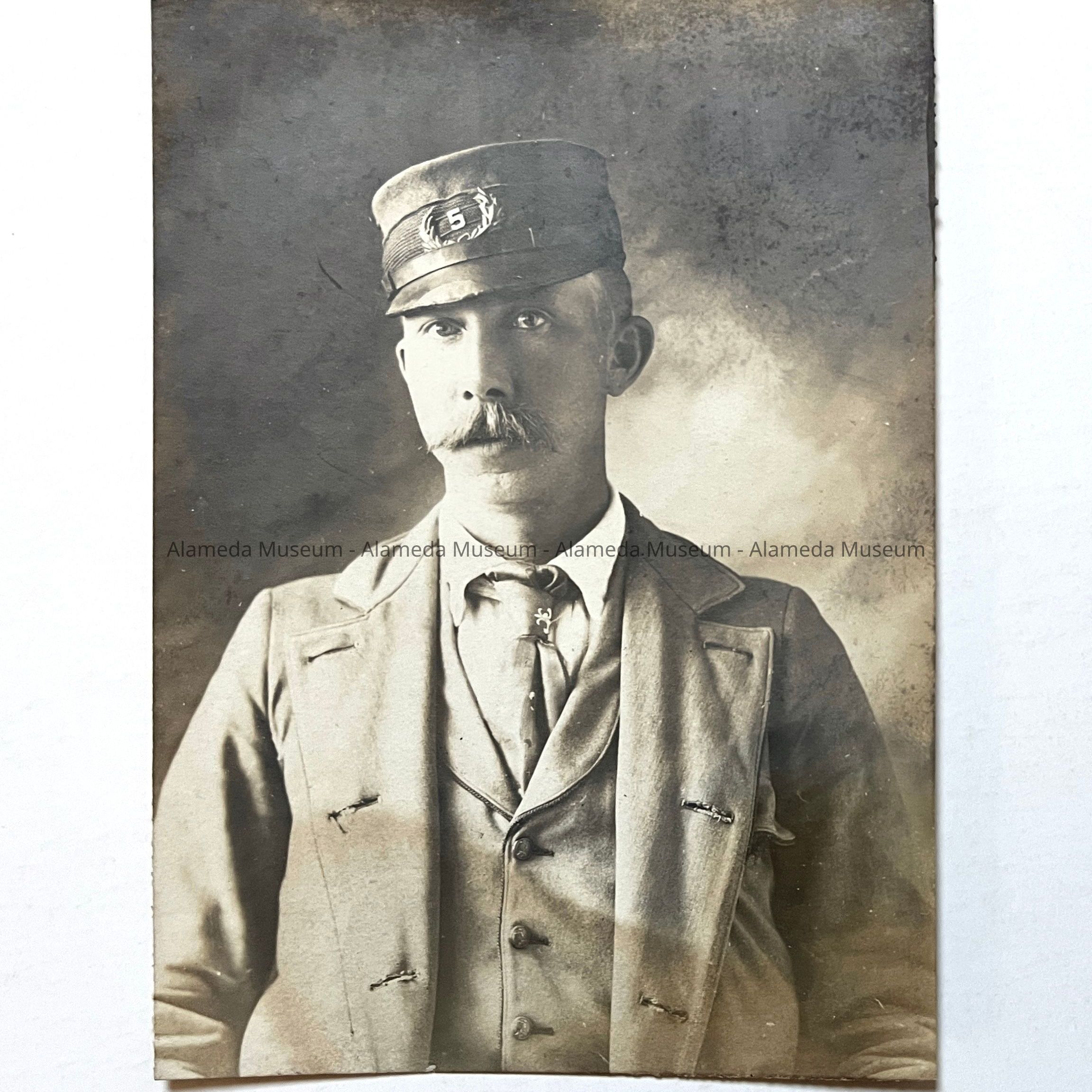 Photo of William Charles Forsyth (in uniform), Alameda Postman, carrier #5. During the year 1890, the Board of Trustees that governed Alameda, applied to the United States Government for free postal delivery to homes. This request was approved which necessitated the hiring and training of postmen. The late Mr. Forsyth told the donor (his stepdaughter) that he was the third man to be hired as Alameda's first group of postmen.