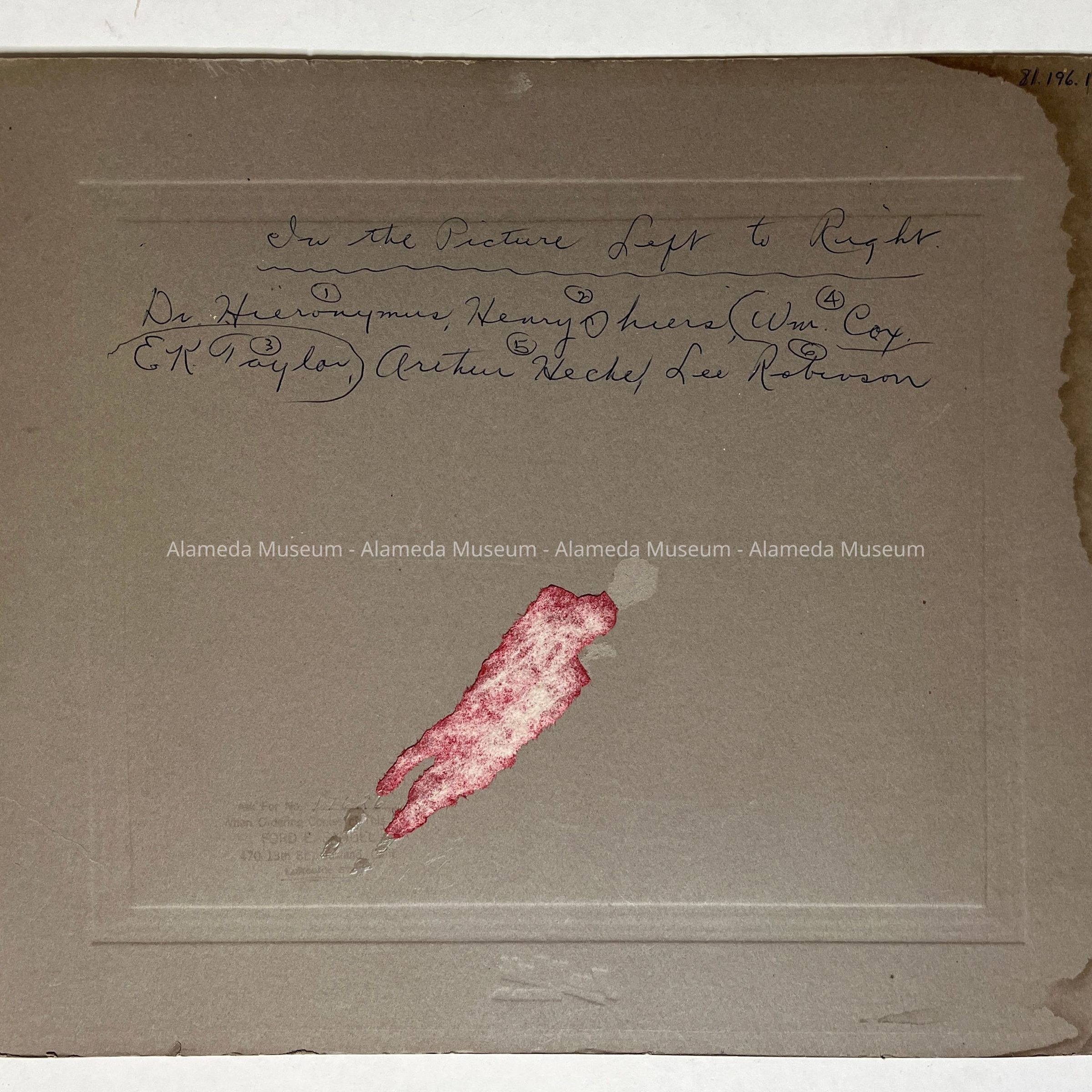 Description: Photograph mounted on heavy cardboard backing. It is signed: Ford E. Samuel, Oakland, Calif. Photographer.