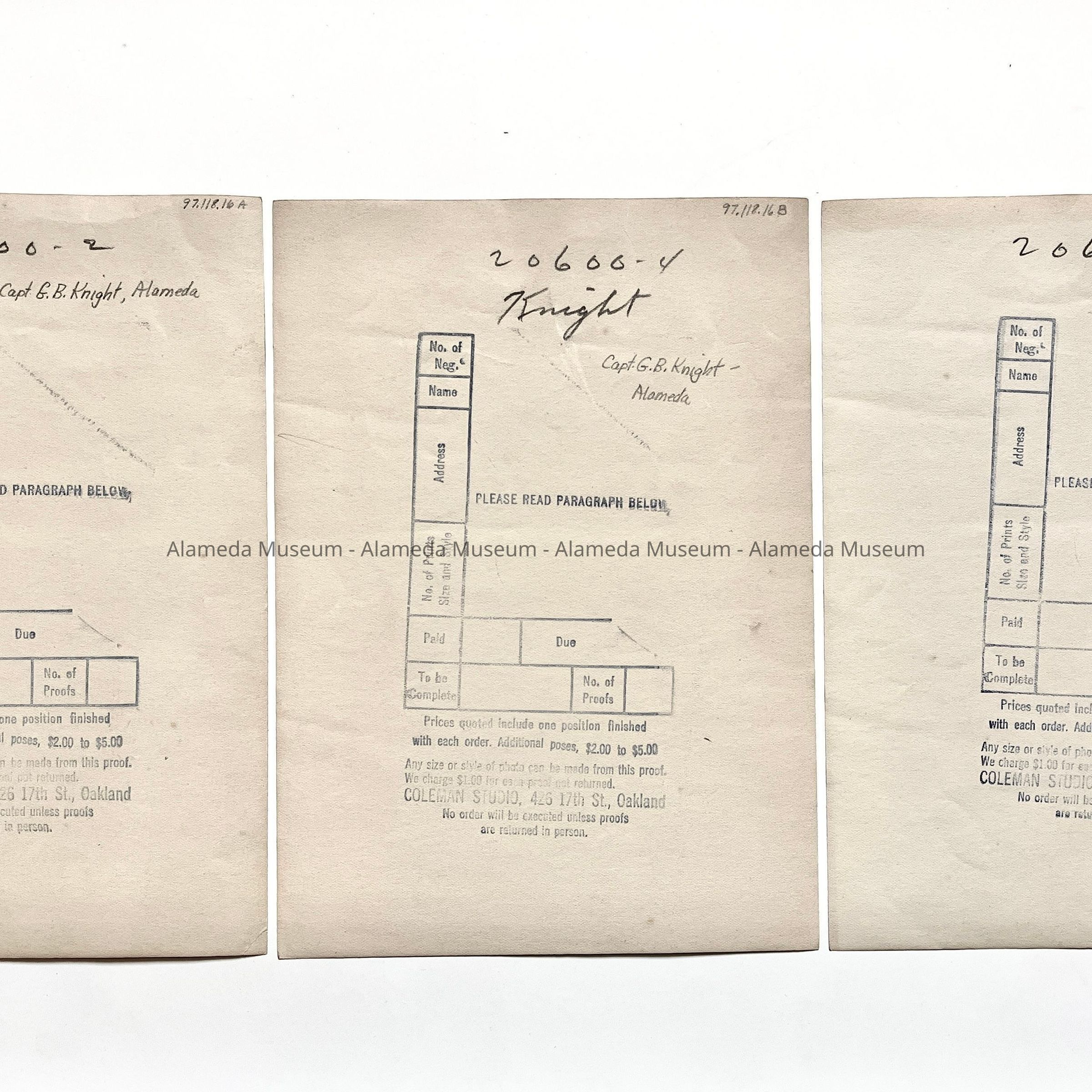 PHOTOGRAPHIC SERIES, WITH MINOR VARIATIONS IN POSE, OF CAPTAIN G B KNIGHT OF ALAMEDA. THE PHOTOGRAPHS ARE PROOFS FOR SELECTIONS TO BE PRINTED.