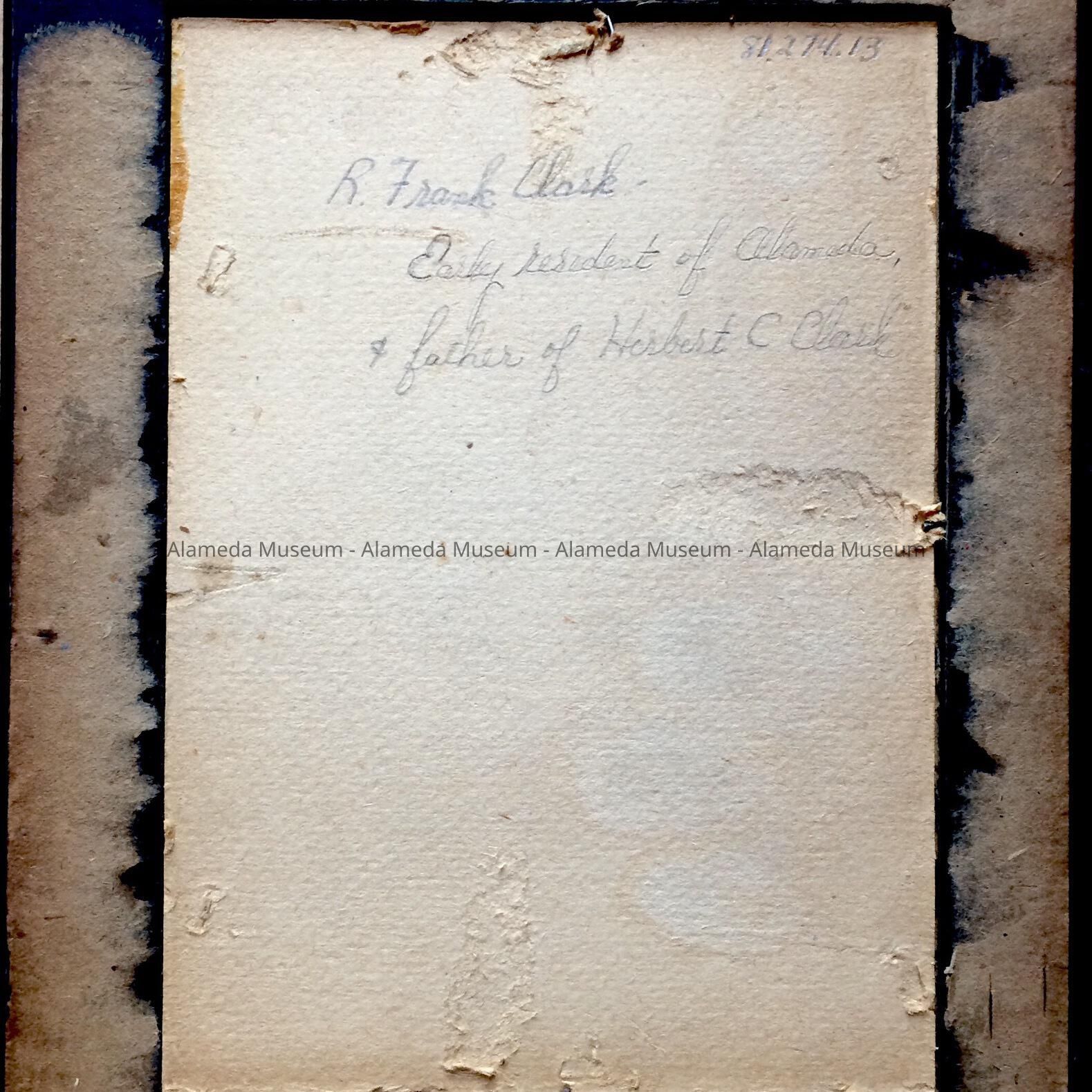 History of Object: Photograph of R. Frank Clark. He was an insurance agent and an early citizen of Alameda. He established his home here in 1878 and was the father of Herbert D. Clark and the grandfather of the donor.
