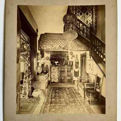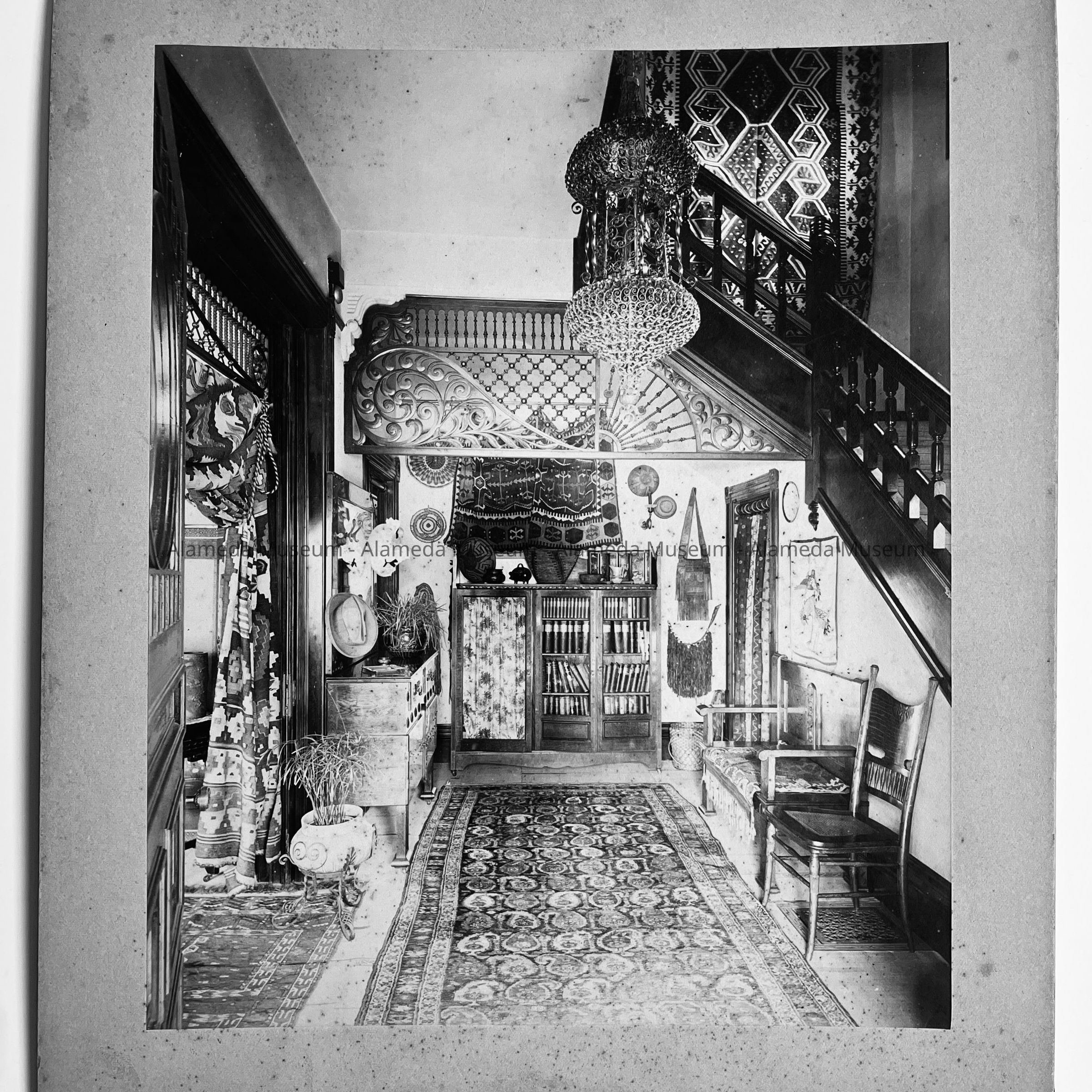 Interior photo, reception hall of 1015 Morton St., Alameda, Erected 1889, for Irving w. Davis, proprietor Golden Rule Bazaar, S. F., by A. W. Pattiani, architect & builder. Cost-$4000. Photo taken when the house was occupied by Granville W. Alexander (S. F. grain broker) and family. They occupied the house from approximately 1894 to 1906.