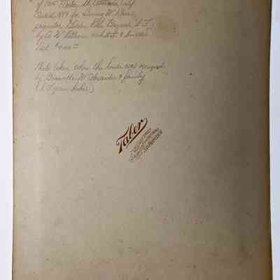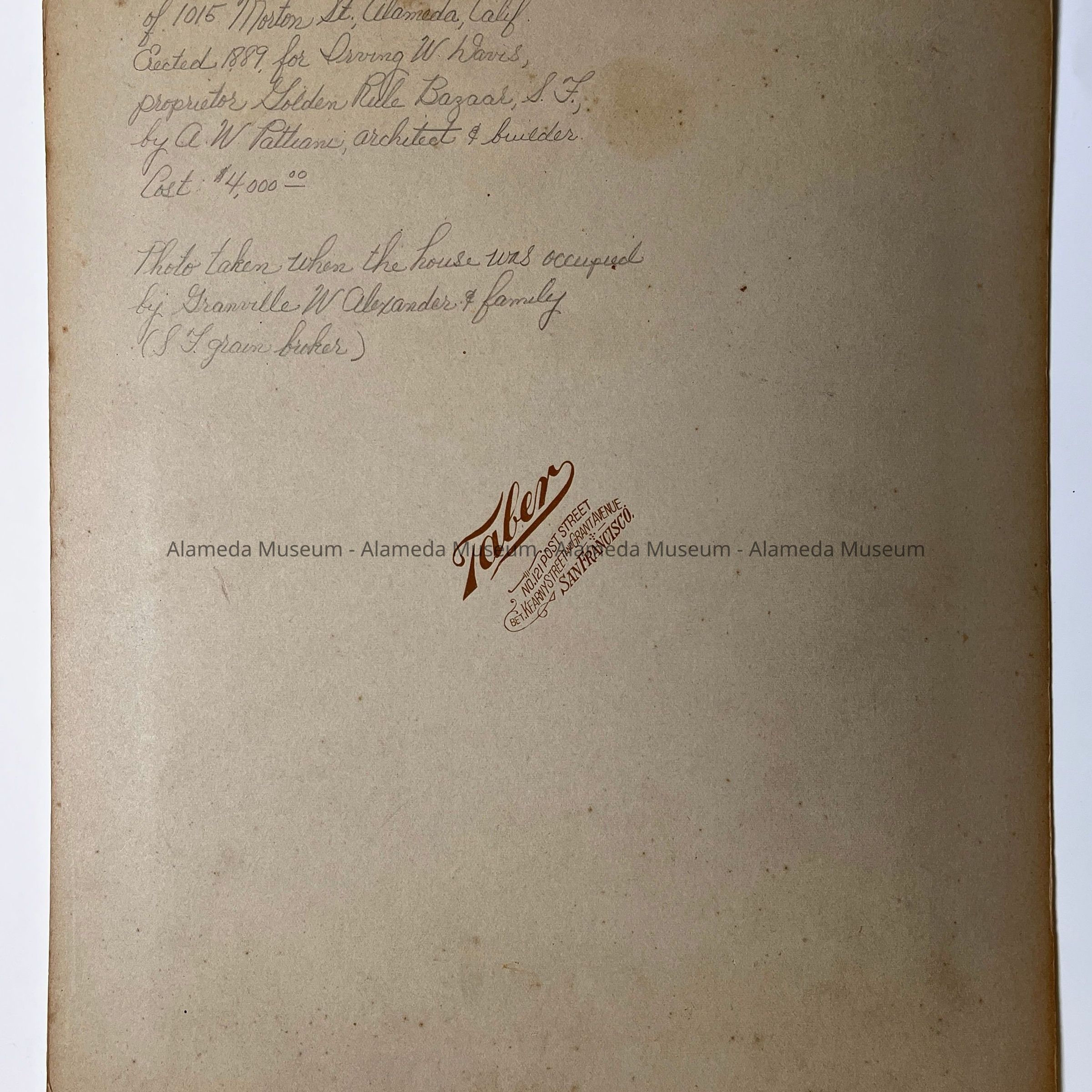 Description: Sepia tinted photograph on heavy off-white colored mounting, on the reverse side in gold type "Taber, No.121 Post Street, bet. Kearny Street and Grant Avenue, San Francisco", has been printed.