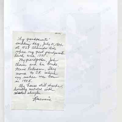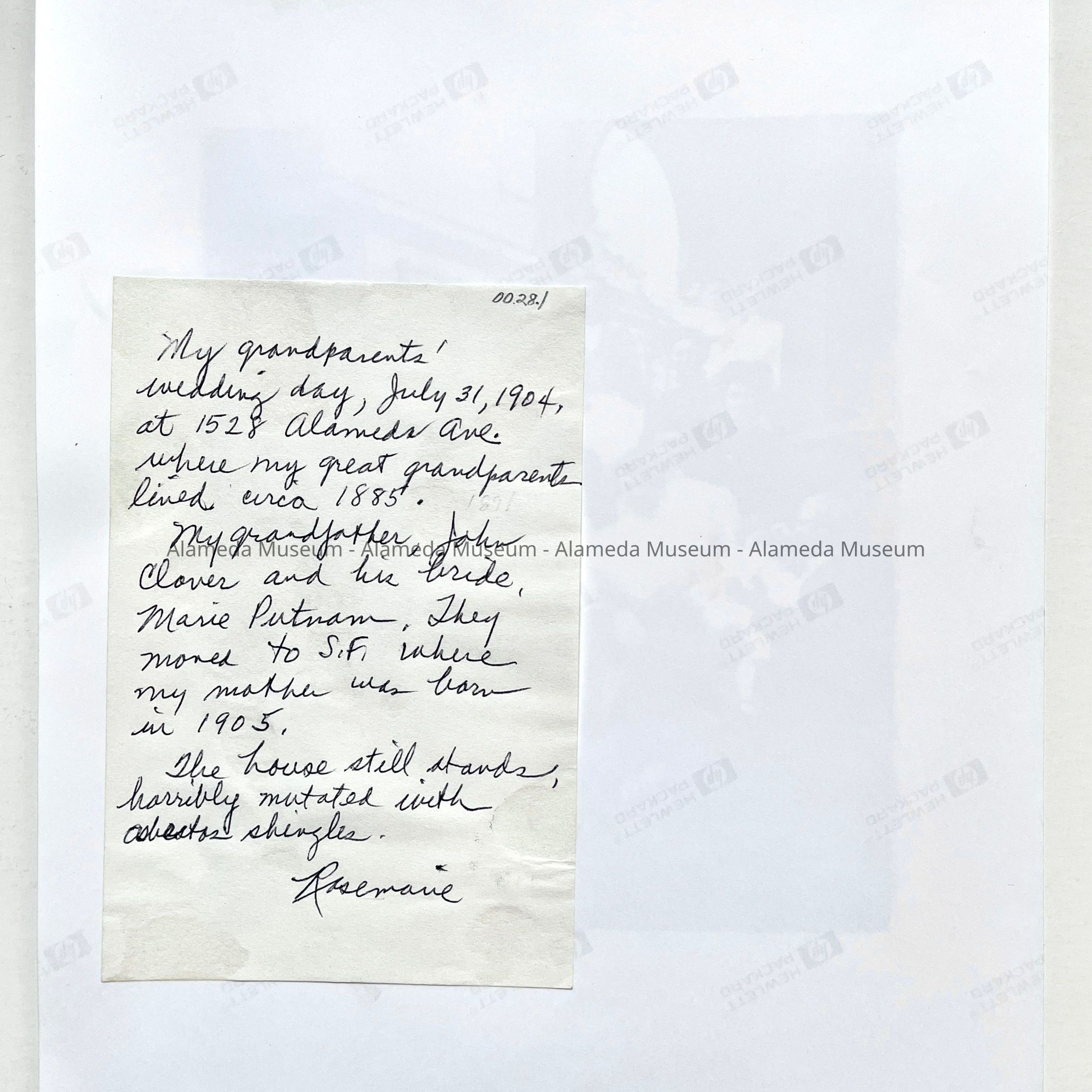 "My grandparents' wedding day, July 3, 1904 at 1528 Alameda Avenue, where my great grandparents lived. My grandfather, John Clover, and his bride, Marie Putnam, moved to San Francisco where my mother was born in 1905. The house still stands, horribly mutated with asbestos shingles." 1528 Alameda Avenue was erected in 1891, Marcuse and Remmel, Builders. It was purchased shortly after construction by George M. Clover.