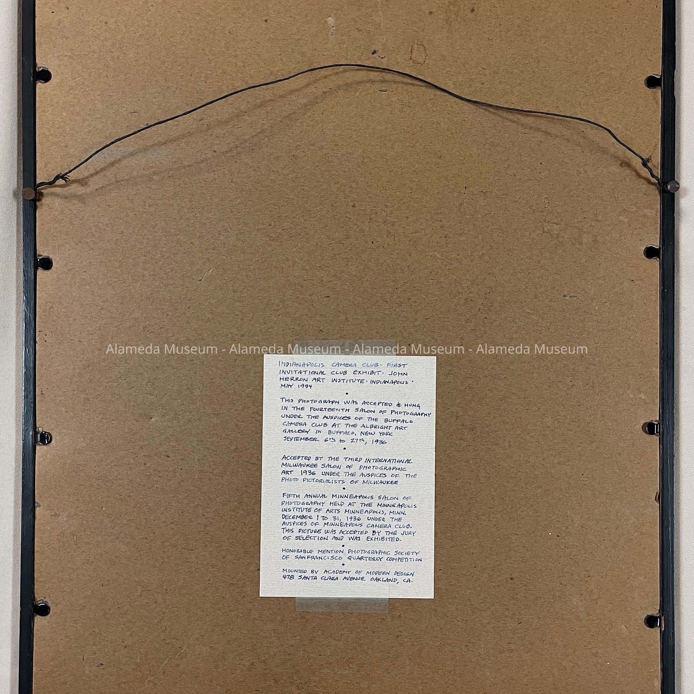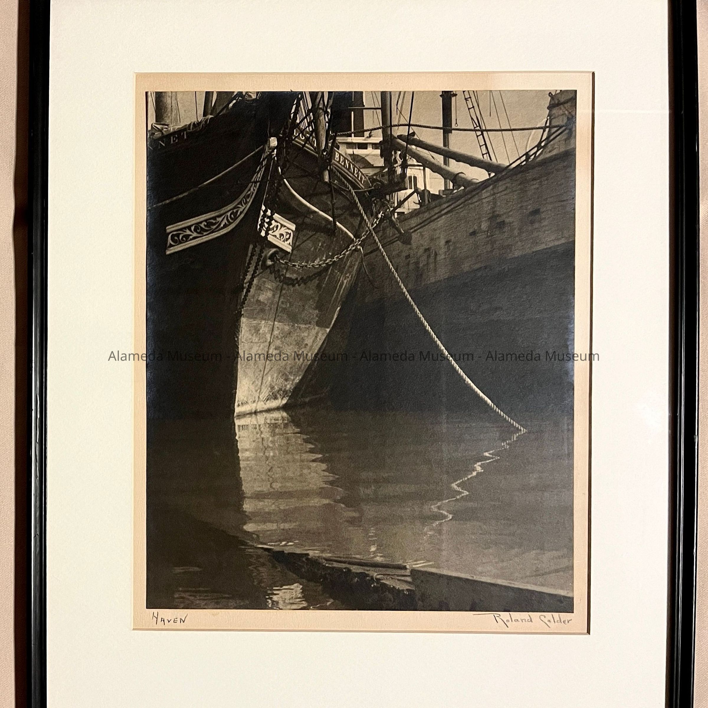 Description: Black & white photo signed in pencil "Roland Colder," & entitled "Haven." Ebonized frame (commercial variety). On the reverse side is a handwritten list of photo credits (exhibitions, etc.).