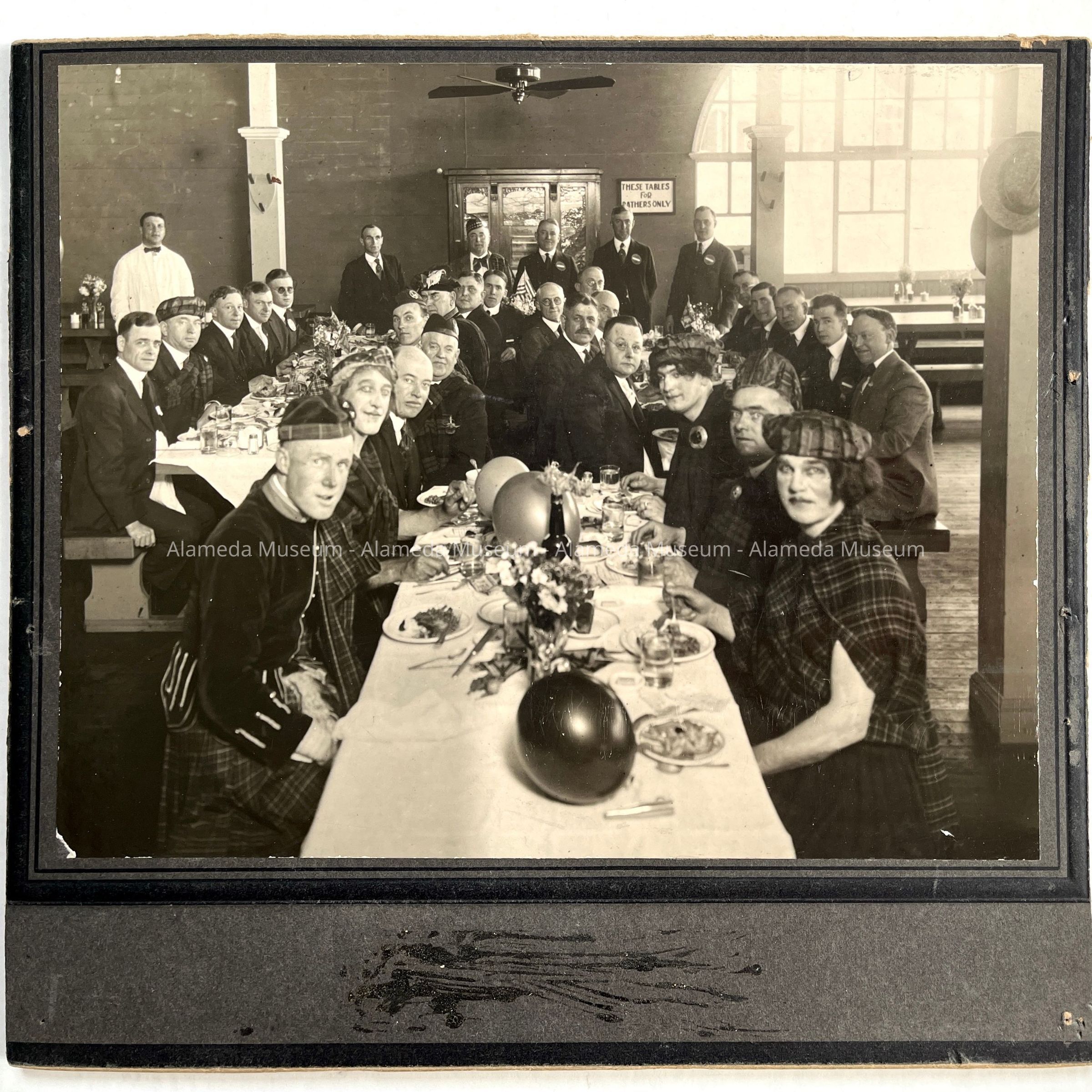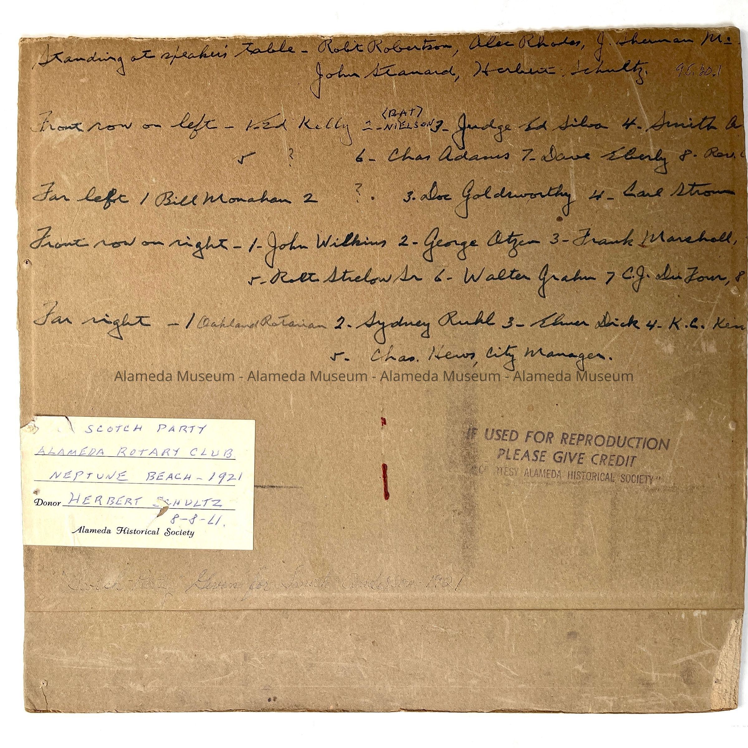 Many are dressed in Scottish attire. The Alameda Rotary Club sponsored this party, and the members and guests are identified on back of the mounting.