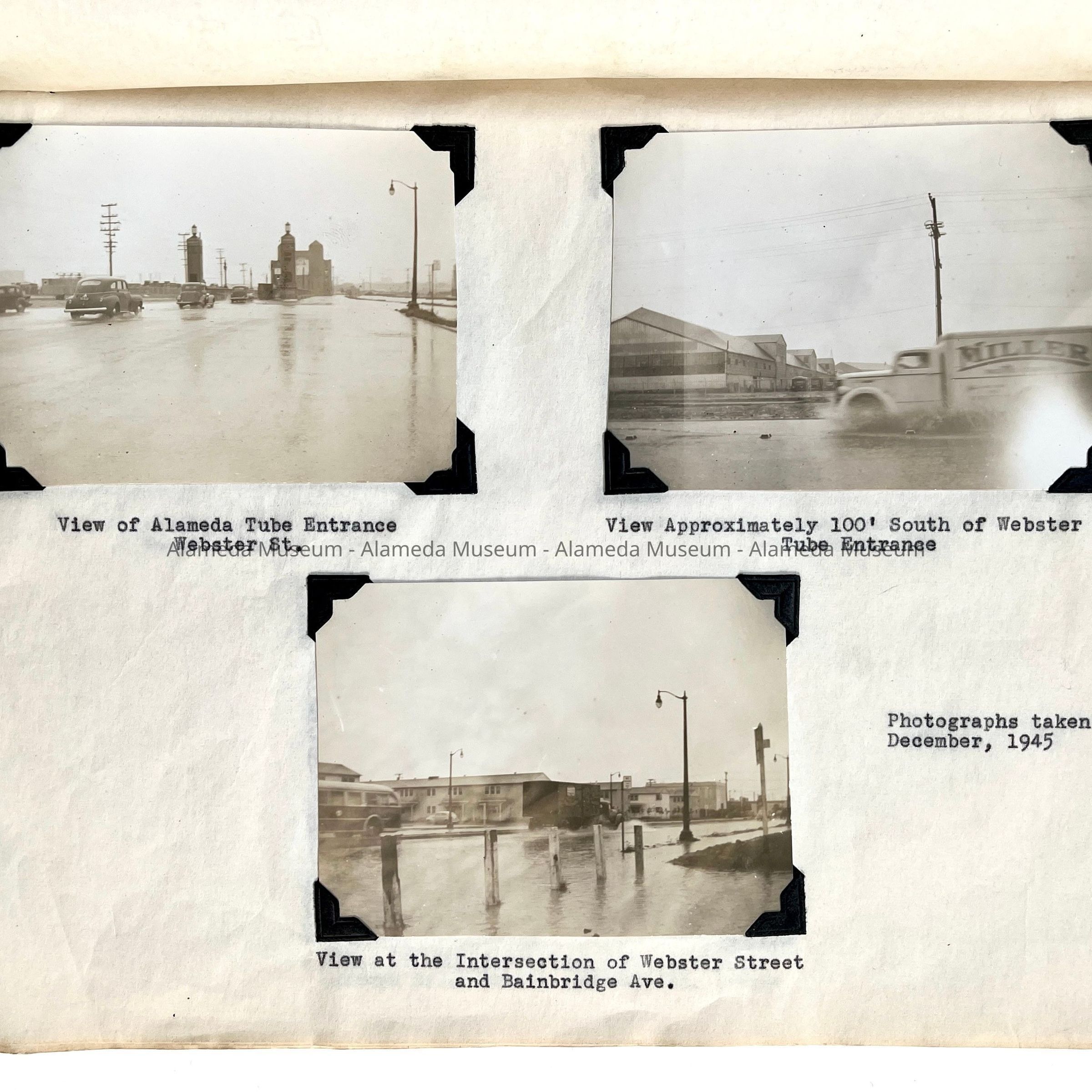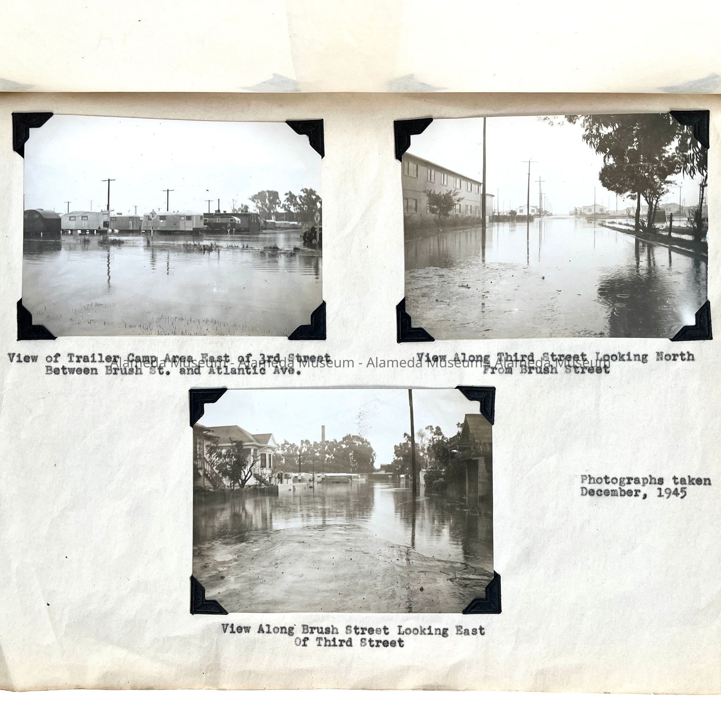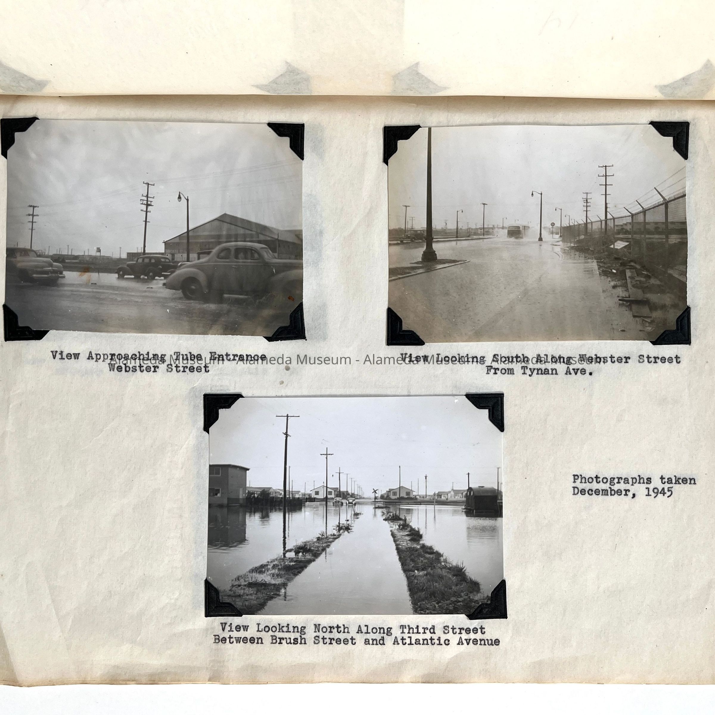 History of Object: Photographs showing flooded conditions caused by National Defense Construction. The general areas affected appear to be along Webster Street, Brush Street, Atlantic Avenue and Third Street near the Naval Air Station. These photos were taken by the Alameda Public Works Department.