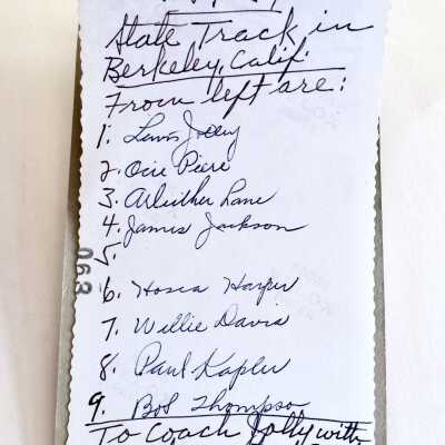 A PHOTOGRAPHIC SERIES OF COACH LEWIS C JOLLEY AND HIS STAR TRACK TEAM MEMBERS AT A TRACK MEET IN BERKELEY, MAY 29, 1954.