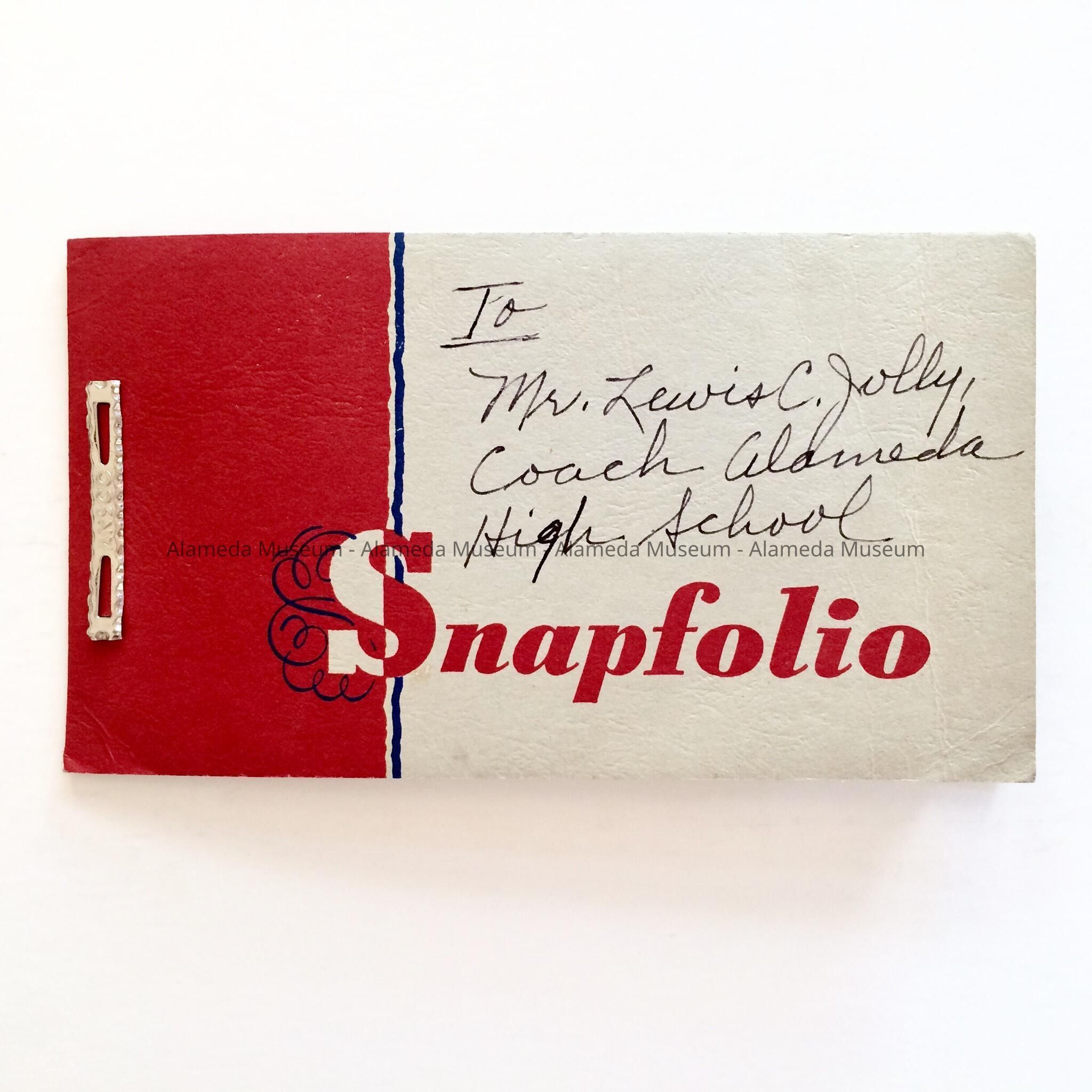 A SERIES OF FIVE PHOTOGRAPHS (GLOSSY BLACK-AND-WHITE) INSIDE A COVERLET, WITH THE CAPTION, "SNAP FOLIO," IN BLUE- AND RED-COLORED TYPE ON A PALE GREEN-COLORED BACKGROUND.