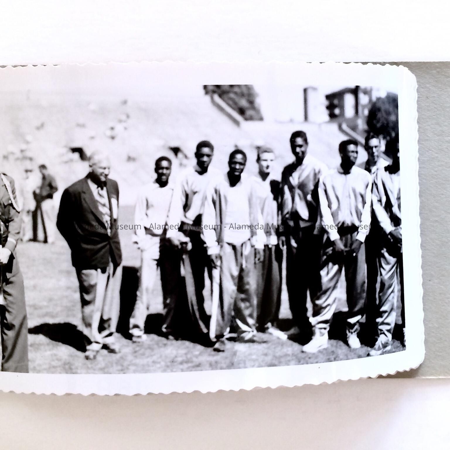 Photo series in a snap folio of Coach Jolley and star track team members, 1954Entry/Object ID
