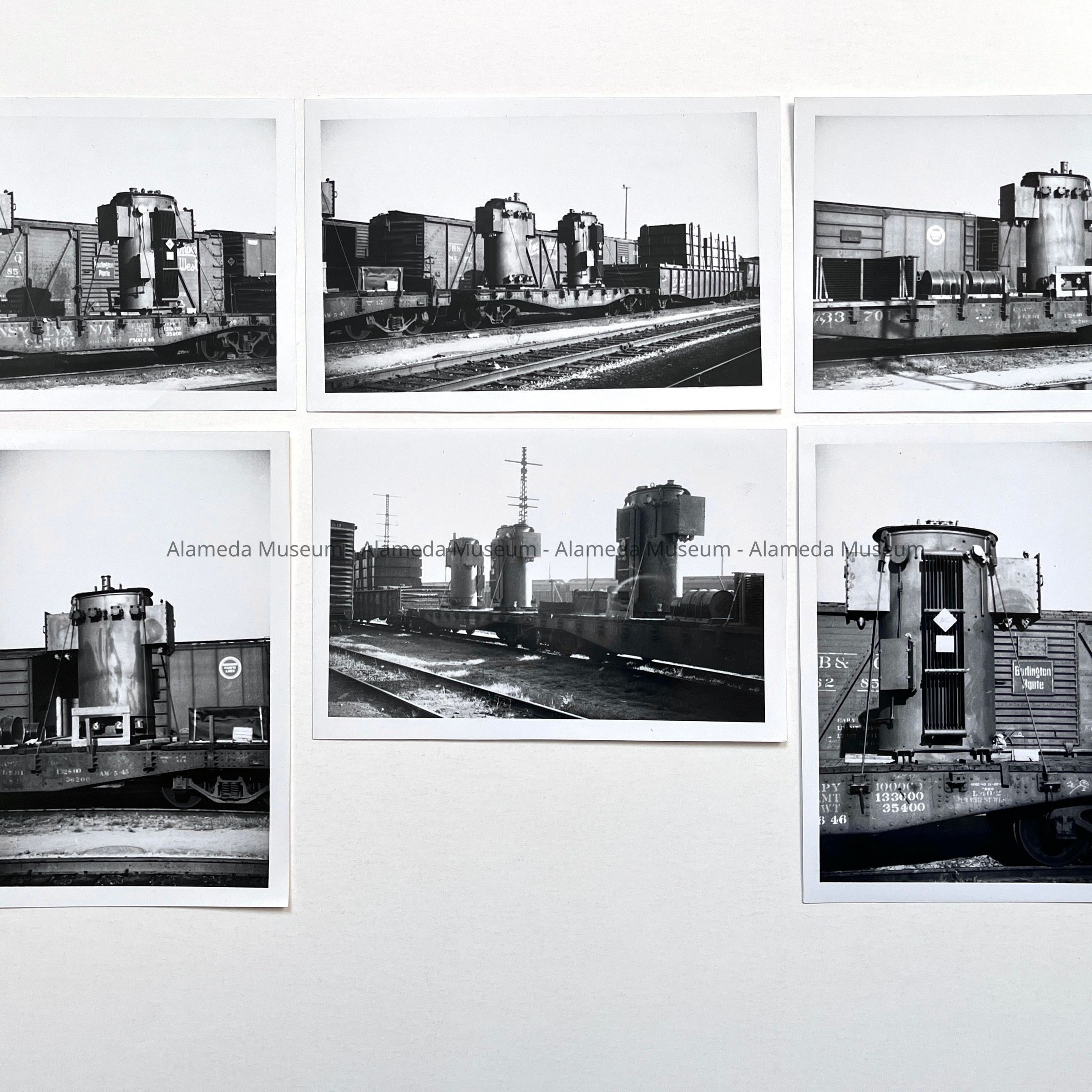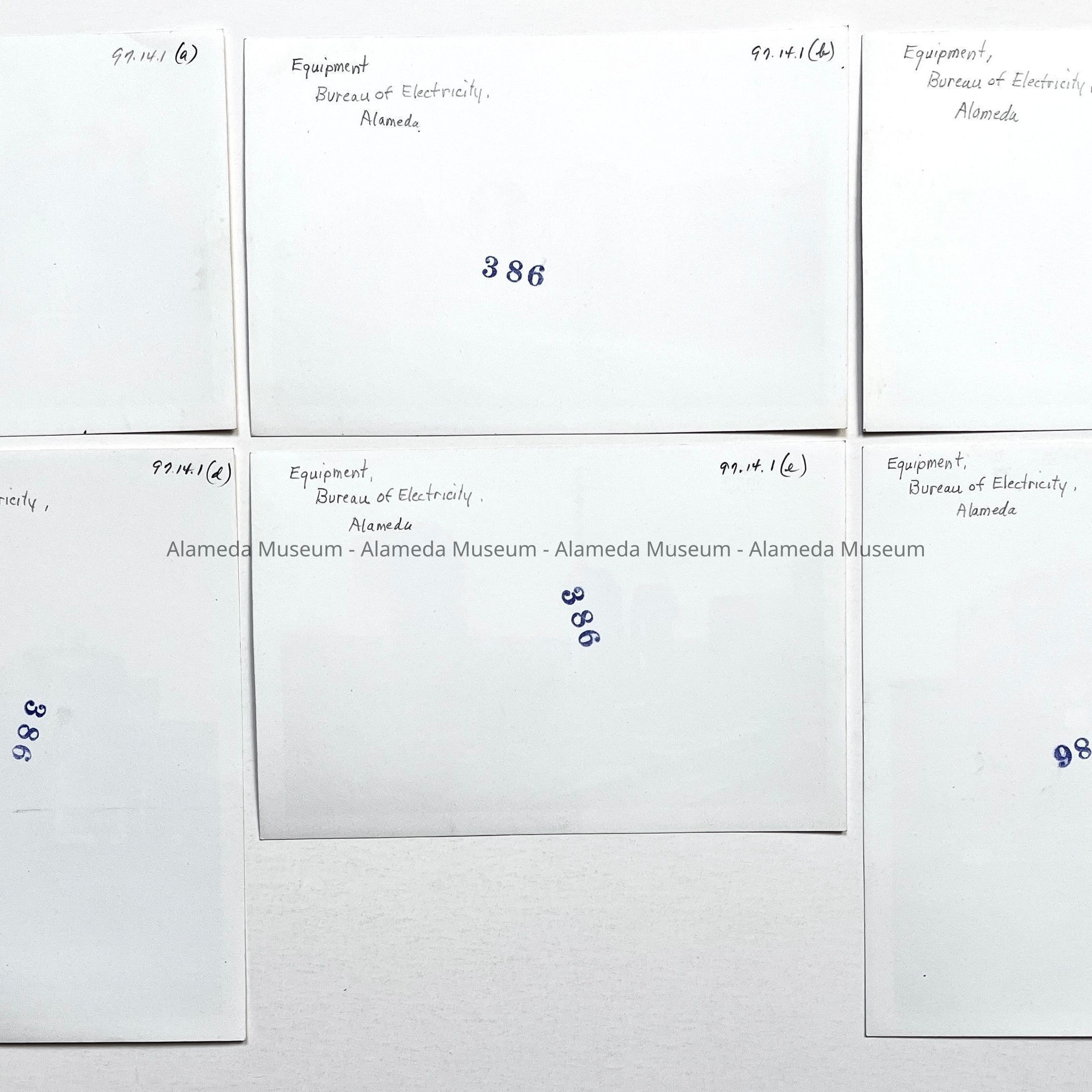 History of Object: Various views of Alameda Bureau of Electricity equipment atop railroad flat cars.