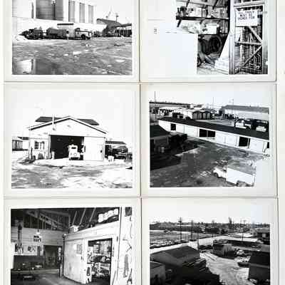 History of Object: Series of views of the City of Alameda Corporation Yard located at 2041 Grand St.: (a) scrap metal pile in the Yard; (b) main entrance; (c) offices; (d) overview of the Yark; (e) garage; (f) another garage w/gas pump; (g) truck parked near tall storage tanks; (h) garage interior, shoving supplies; (i) garage; (j) Yard over view; (k) interior of a vehicle maintenance garage; (l) another overhead view of Yard; (m) storage facility; (n) base of office building; (o) small garage.