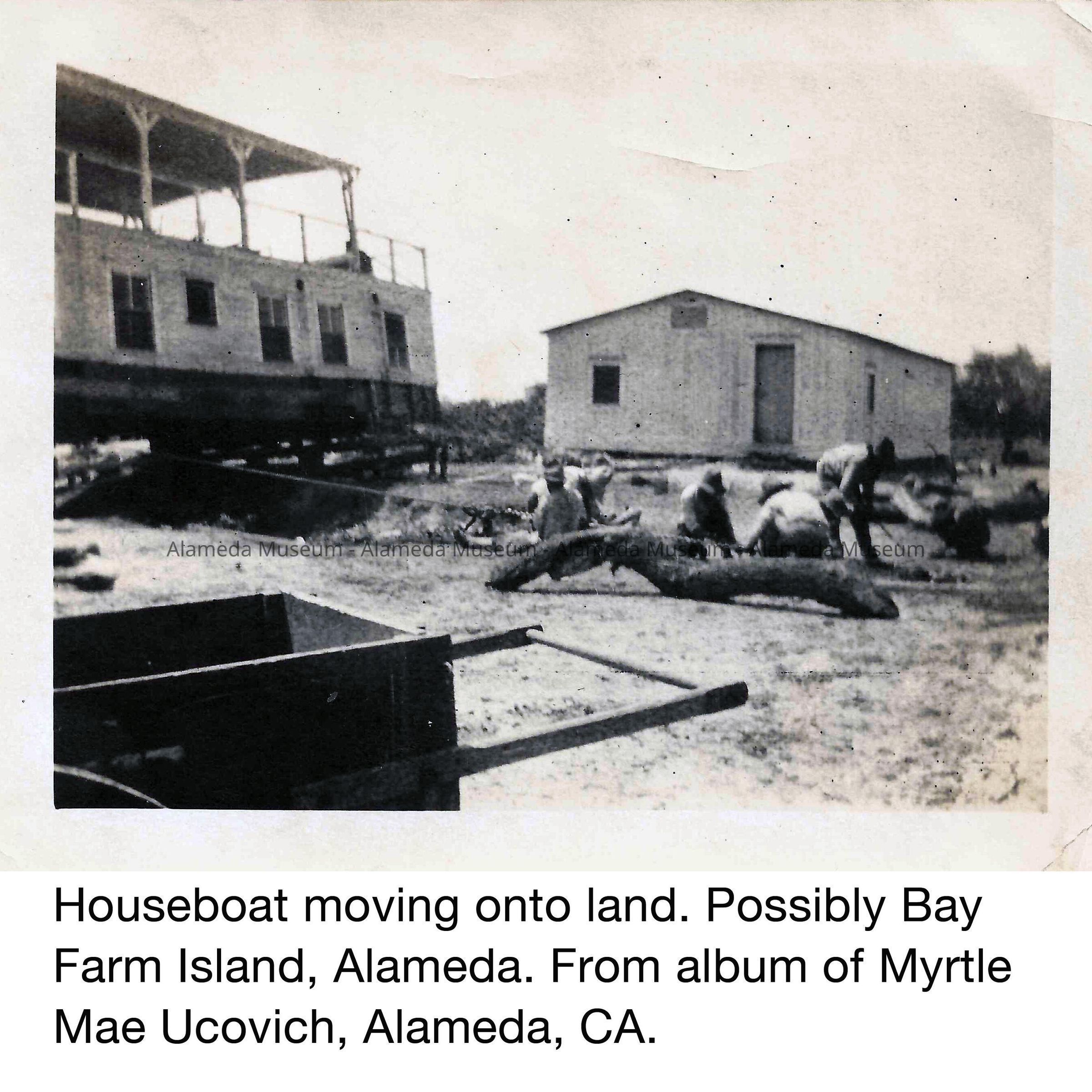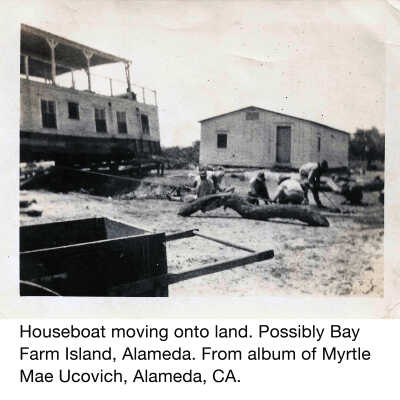 History: Photos of moving a houseboat from water to land, possibly on Bay Farm Island. Photos from the album of Myrtle Mae Ellsworth Ucovich (the grandmother of the donor). She lived in Alameda between 1933 and 1938. Additional background information is provided (see Notes / reverse)