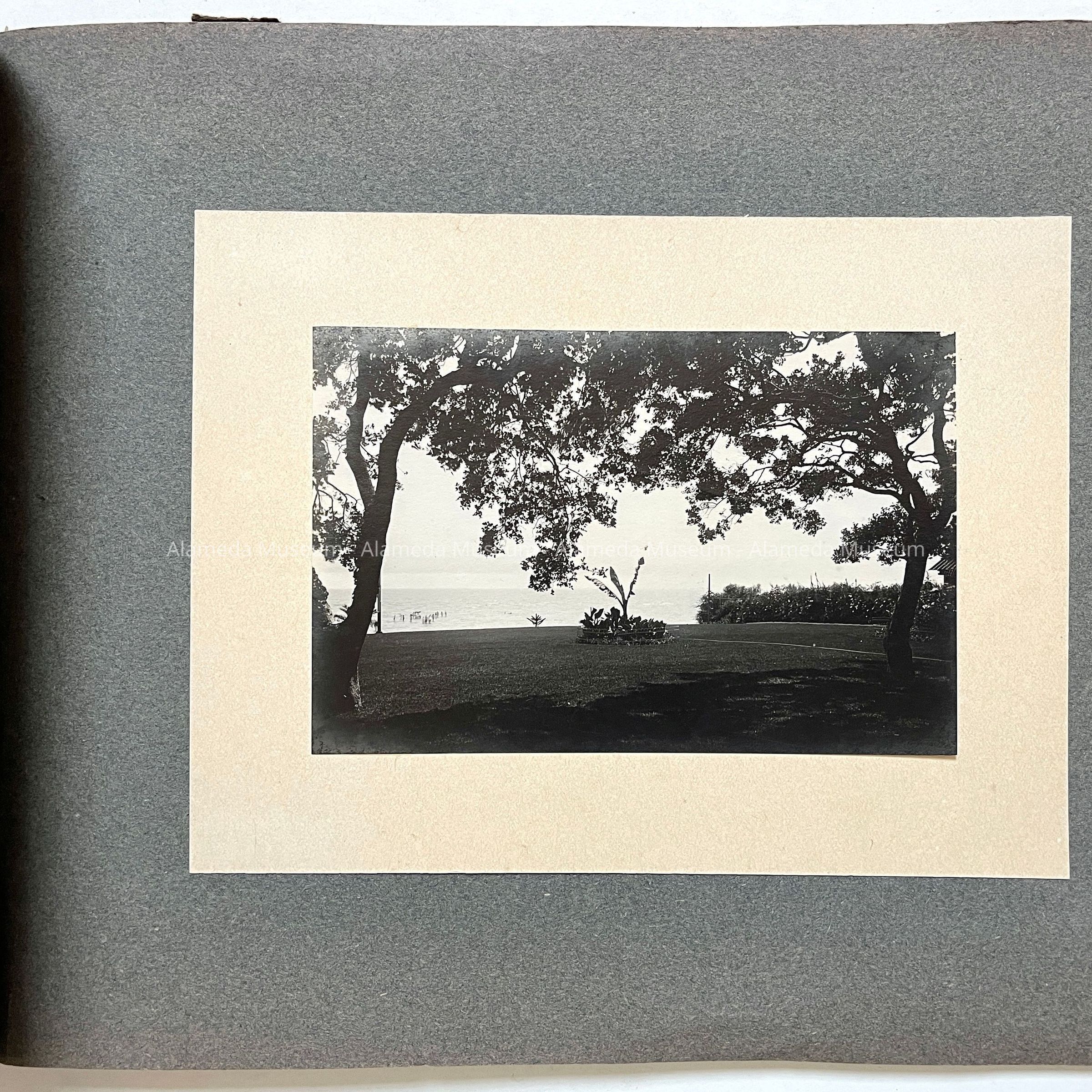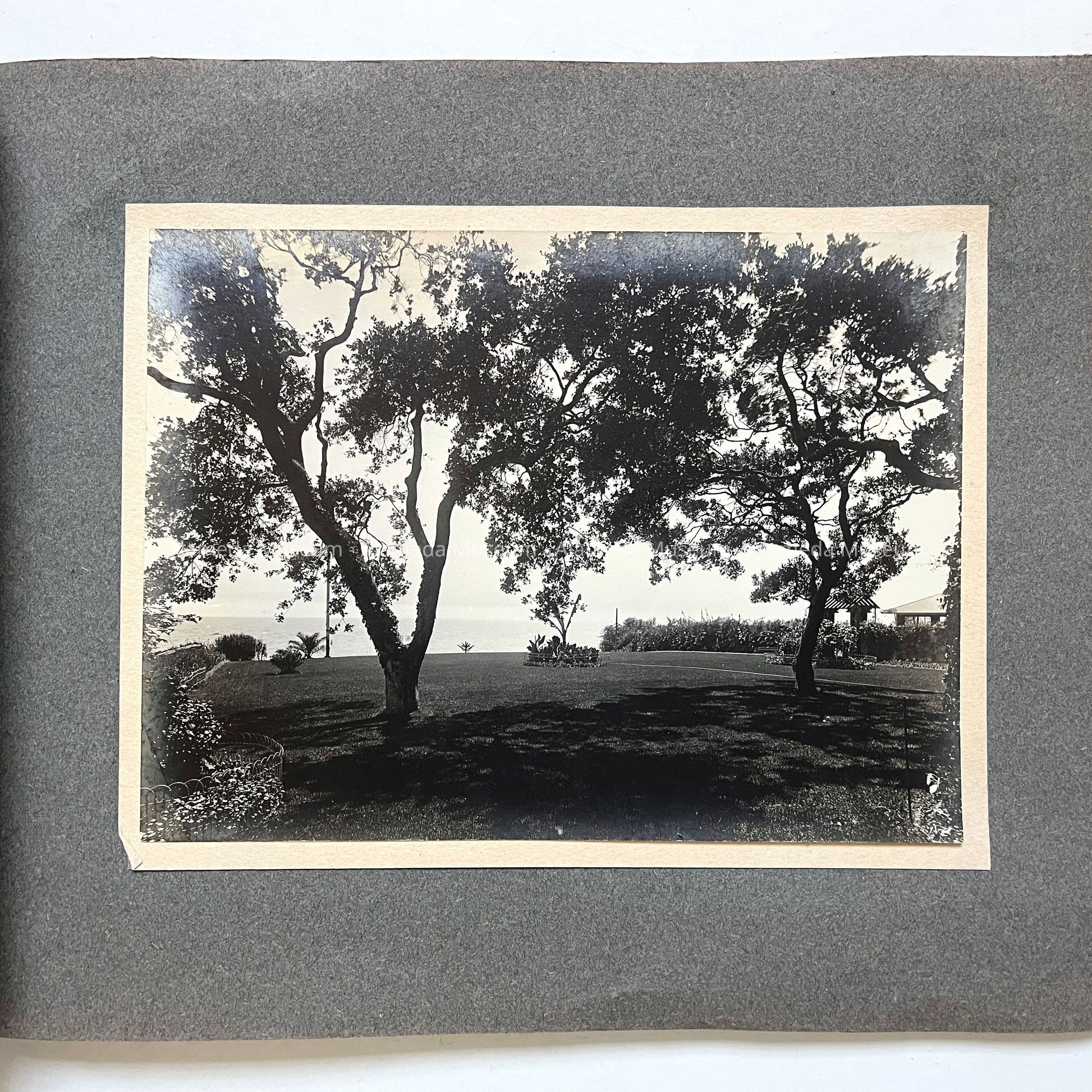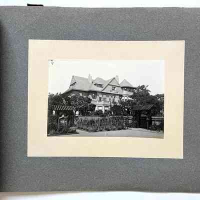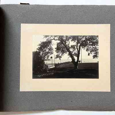 Description: Professionally photographed series of 18 black/white photos mounted on grey scrapbook paper in a loosely bound album with brown paper endpapers, held together by a greenish gold knotted lace. Photographer unknown. Some damage (tears and creases) to the front and back end pages, and a small segment is missing from the lower left corner of the first photograph.