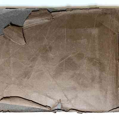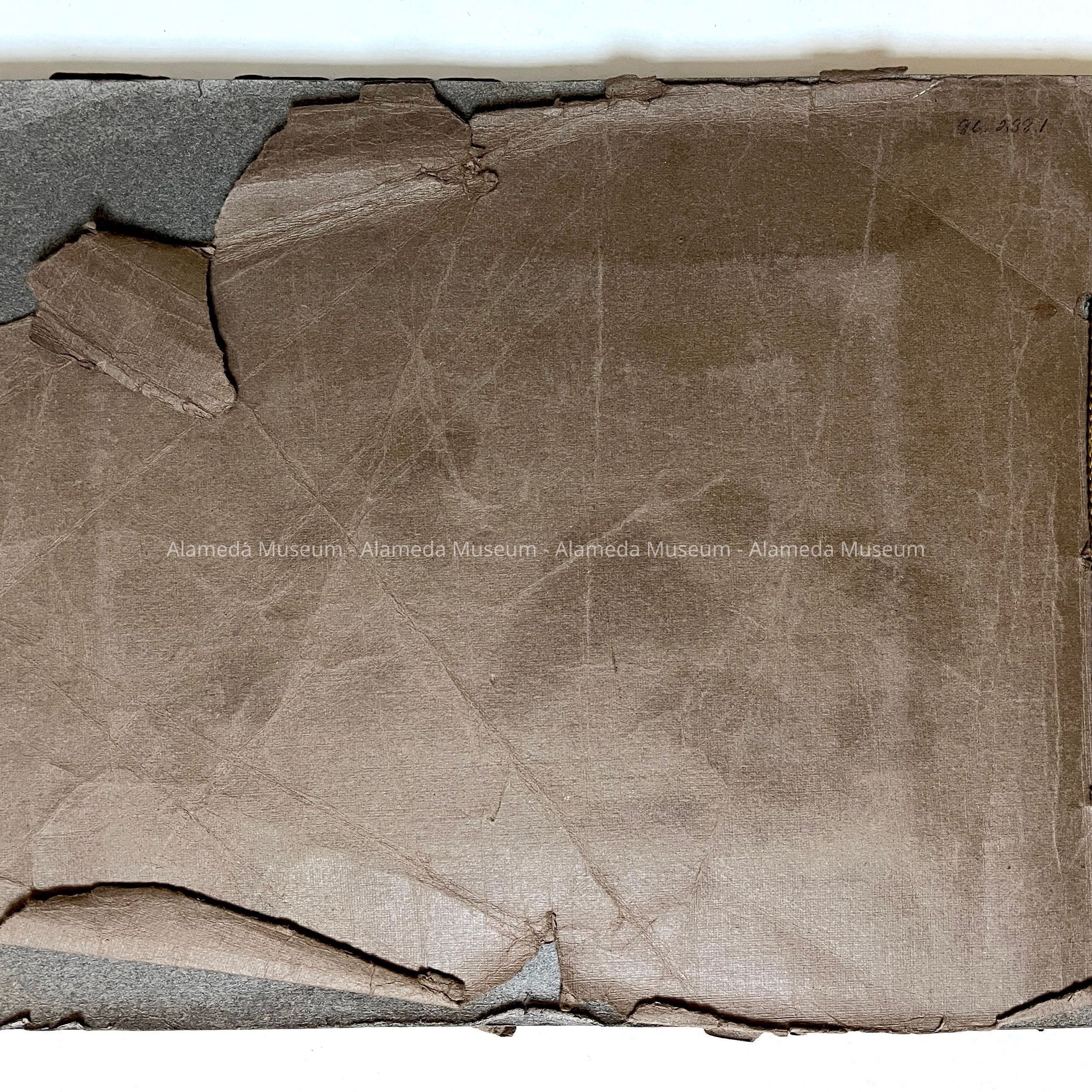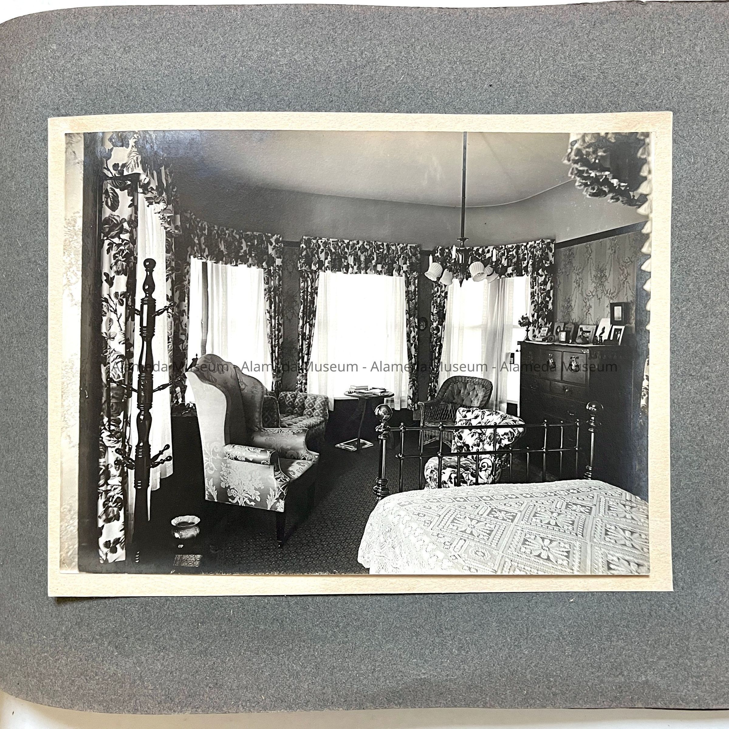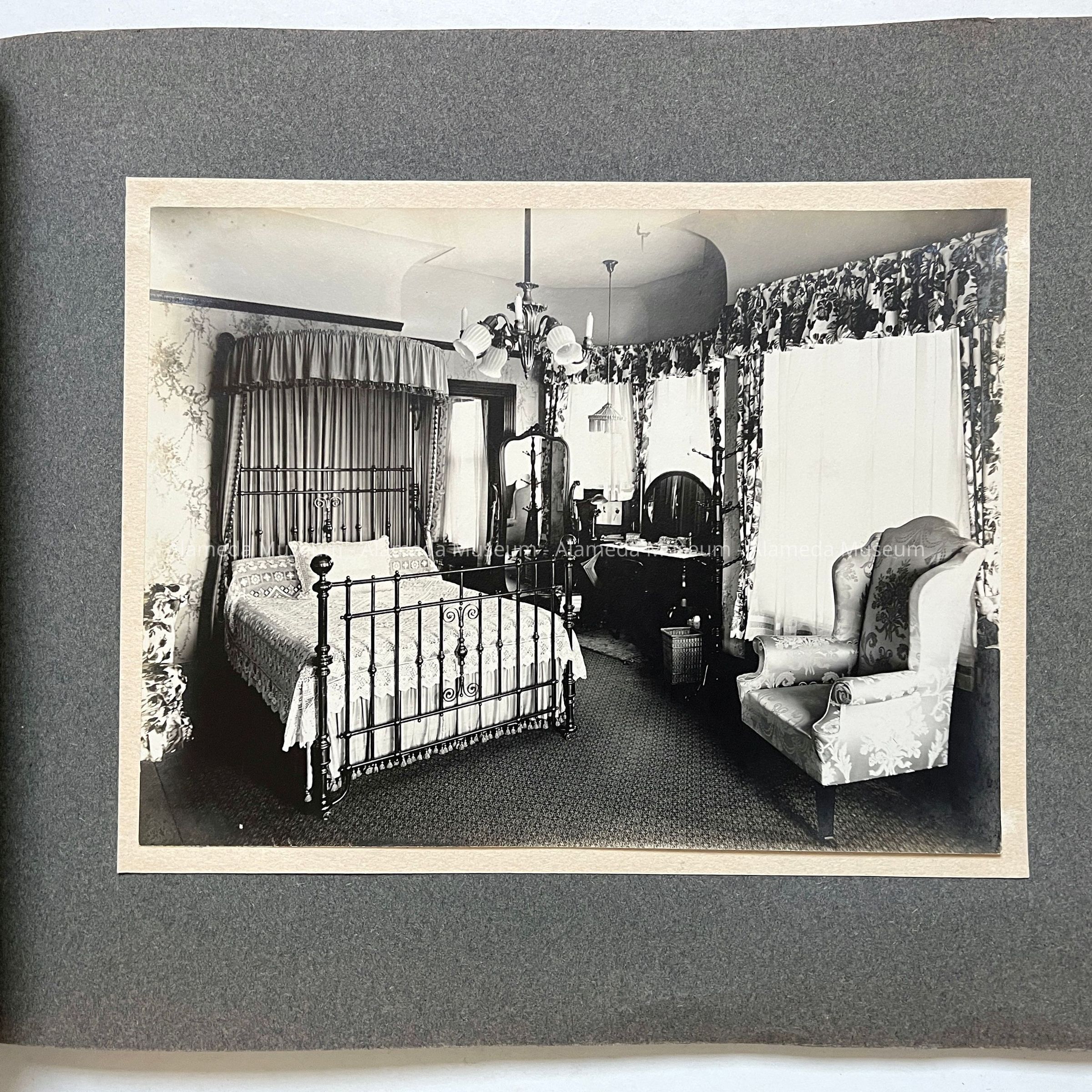 Description: Professionally photographed series of 18 black/white photos mounted on grey scrapbook paper in a loosely bound album with brown paper endpapers, held together by a greenish gold knotted lace. Photographer unknown. Some damage (tears and creases) to the front and back end pages, and a small segment is missing from the lower left corner of the first photograph.