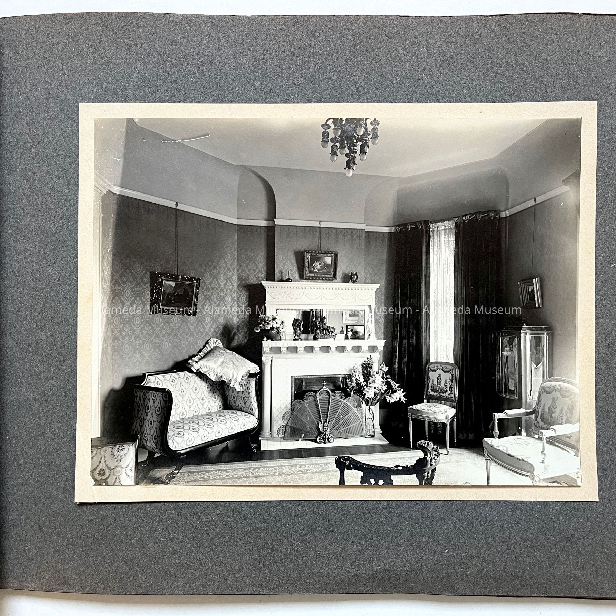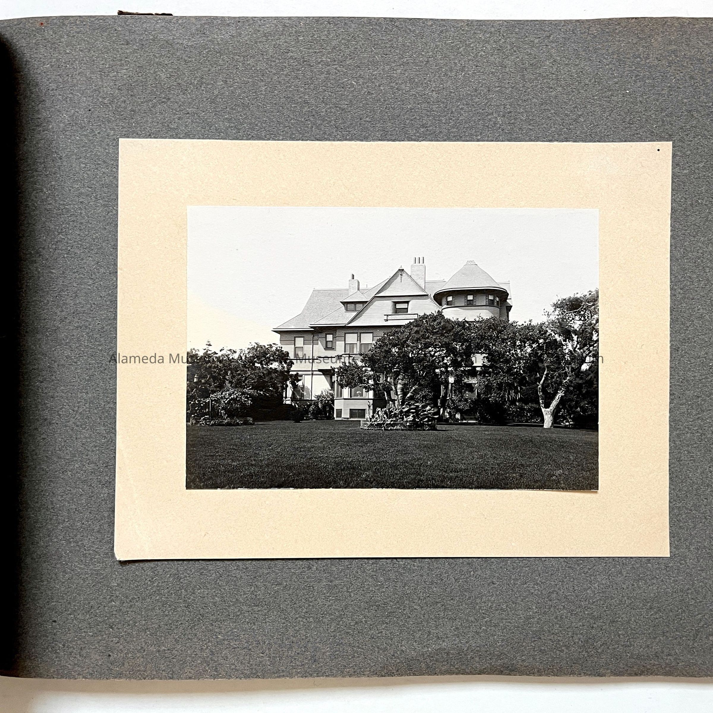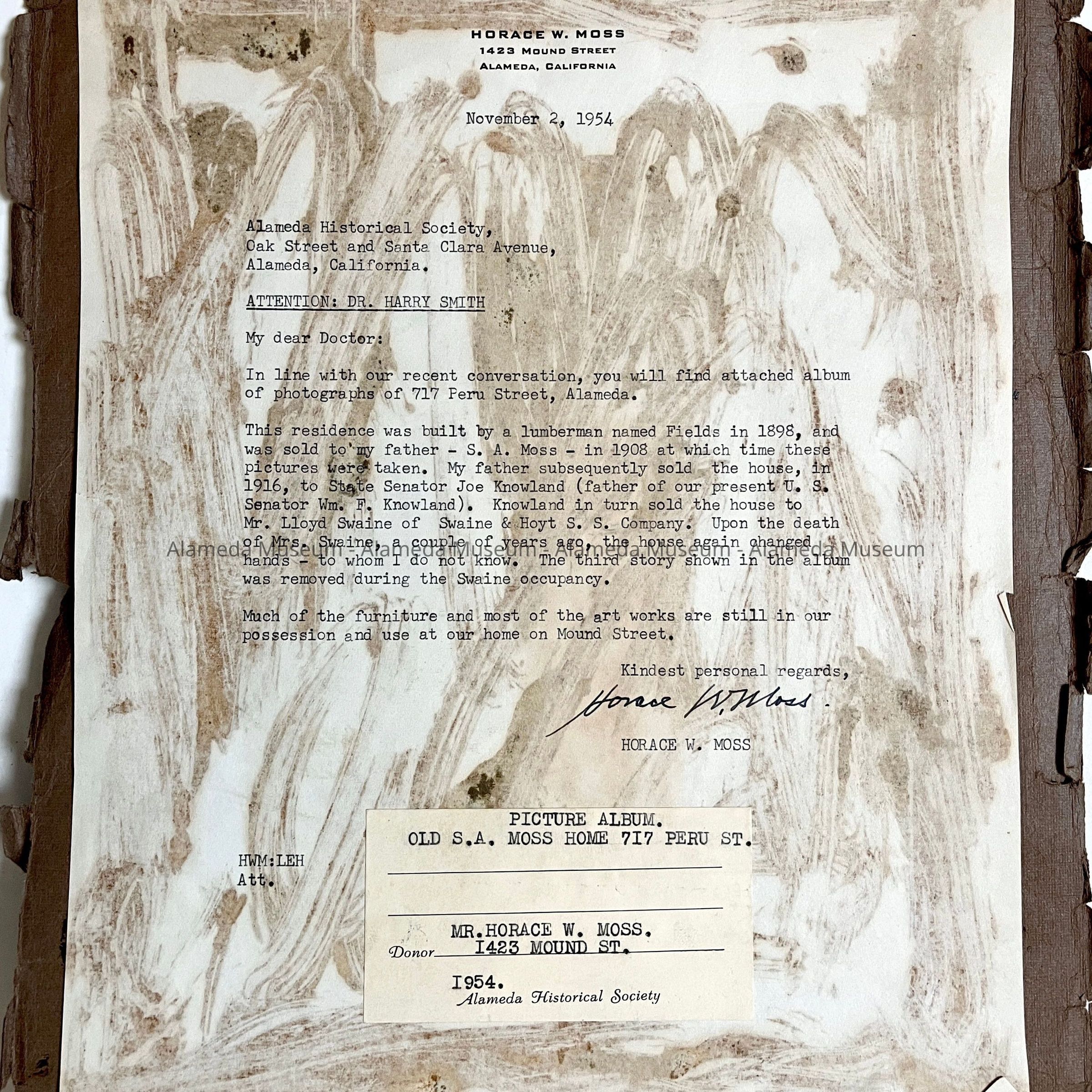 The house was built in 1893 by lumberman H.K. Fields, then sold in 1908 to S.A. Moss (father of the donor), again sold in 1916 to State Senator Joseph R. Knowland, who eventually sold it to Lloyd Swaine (who ultimately removed the third story). The home is now stuccoed into a Mediterranean design.