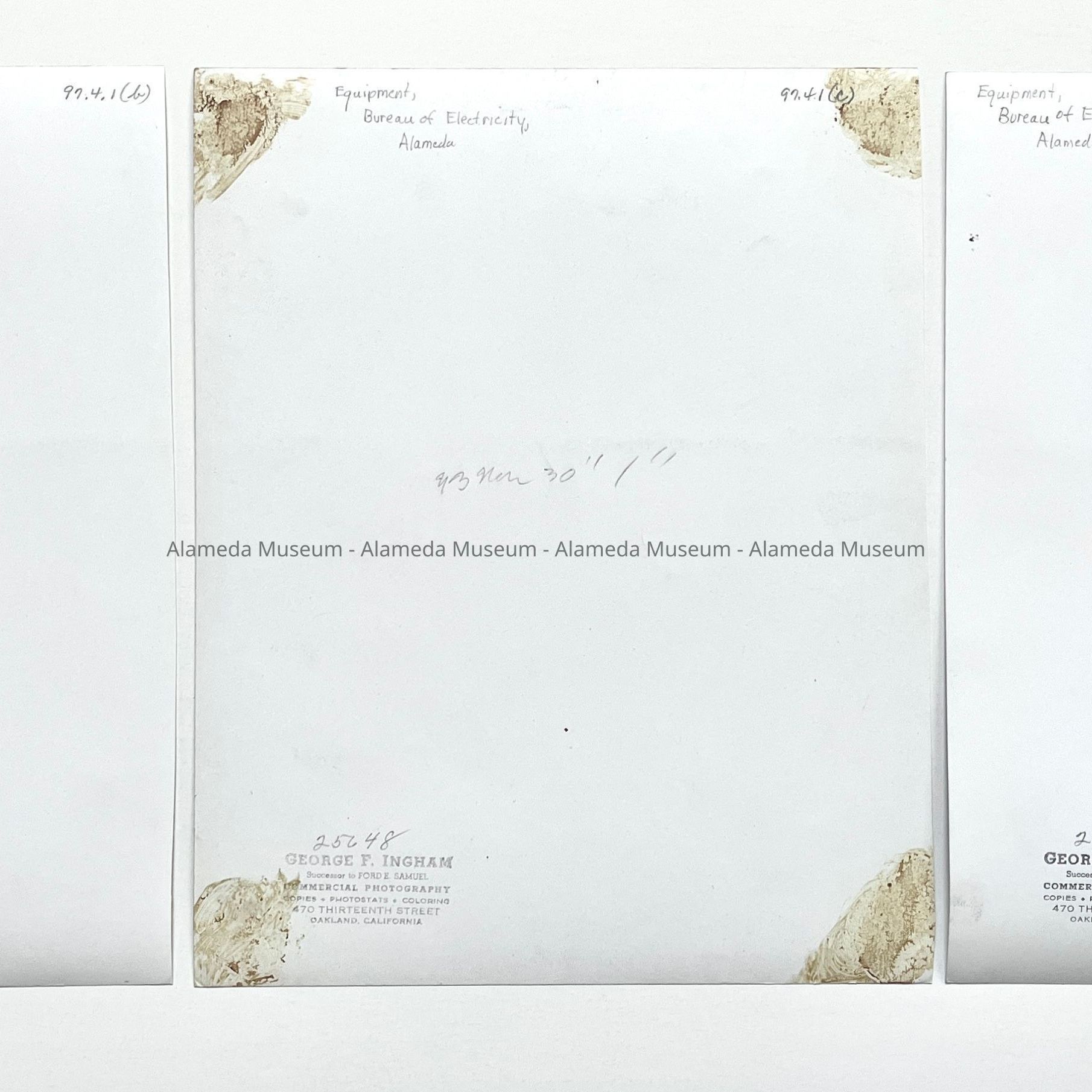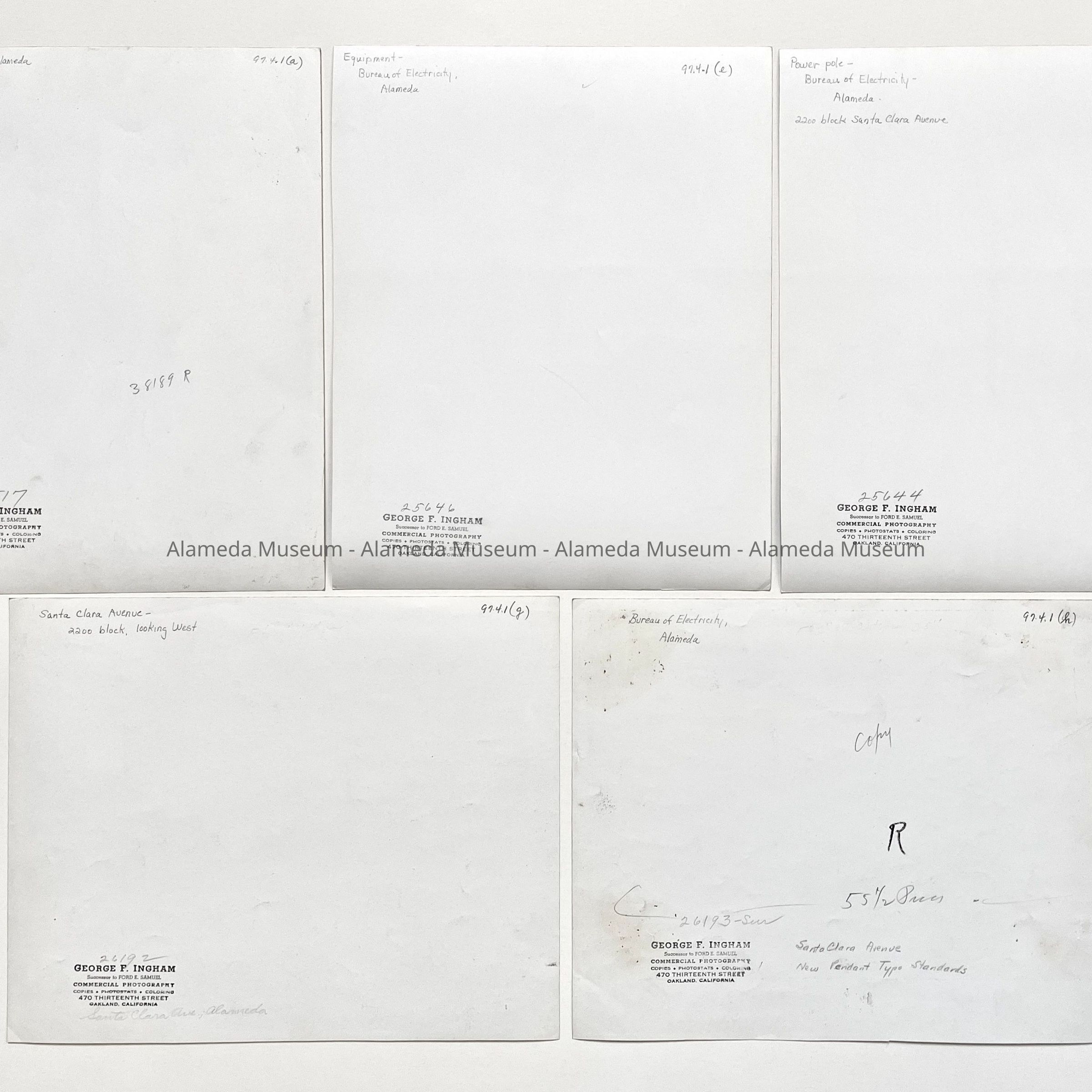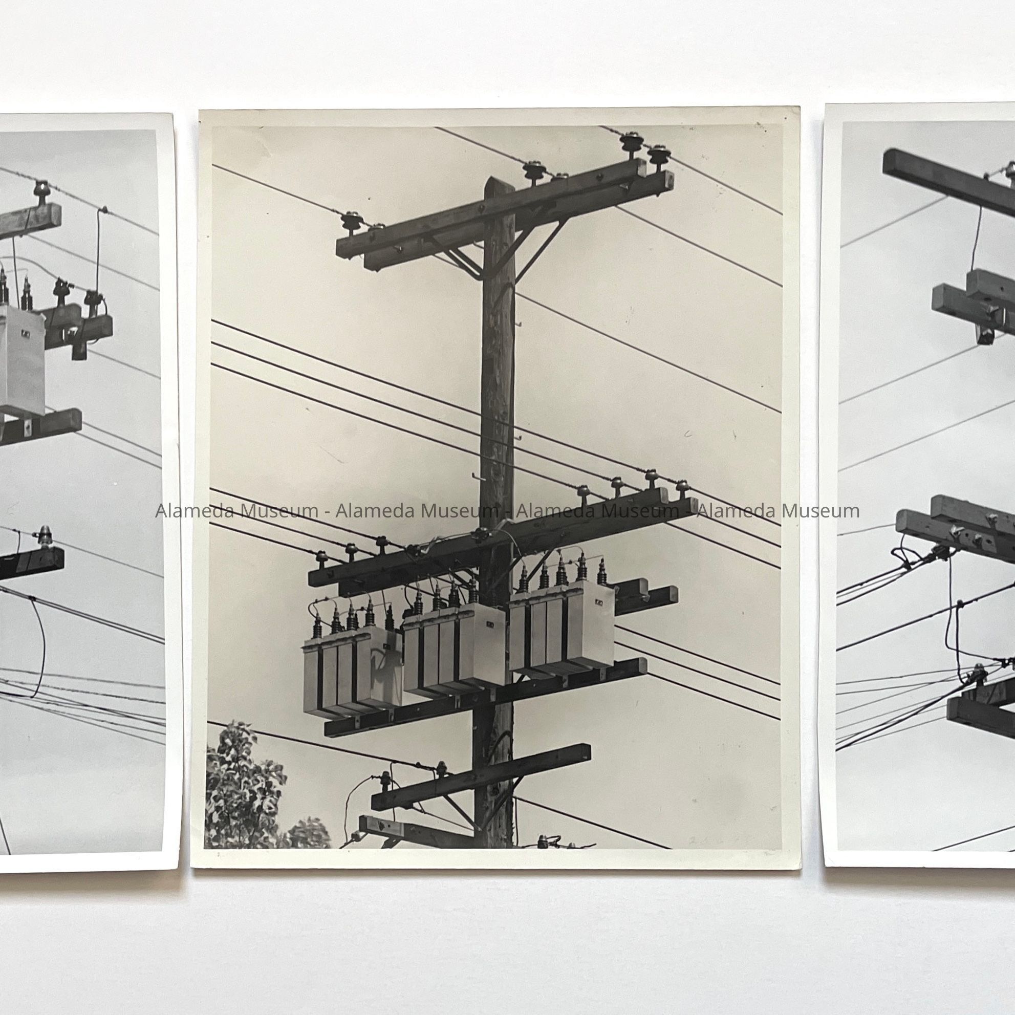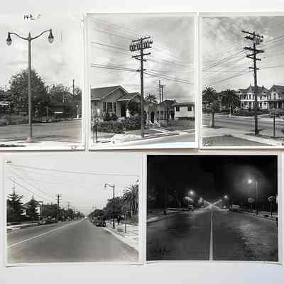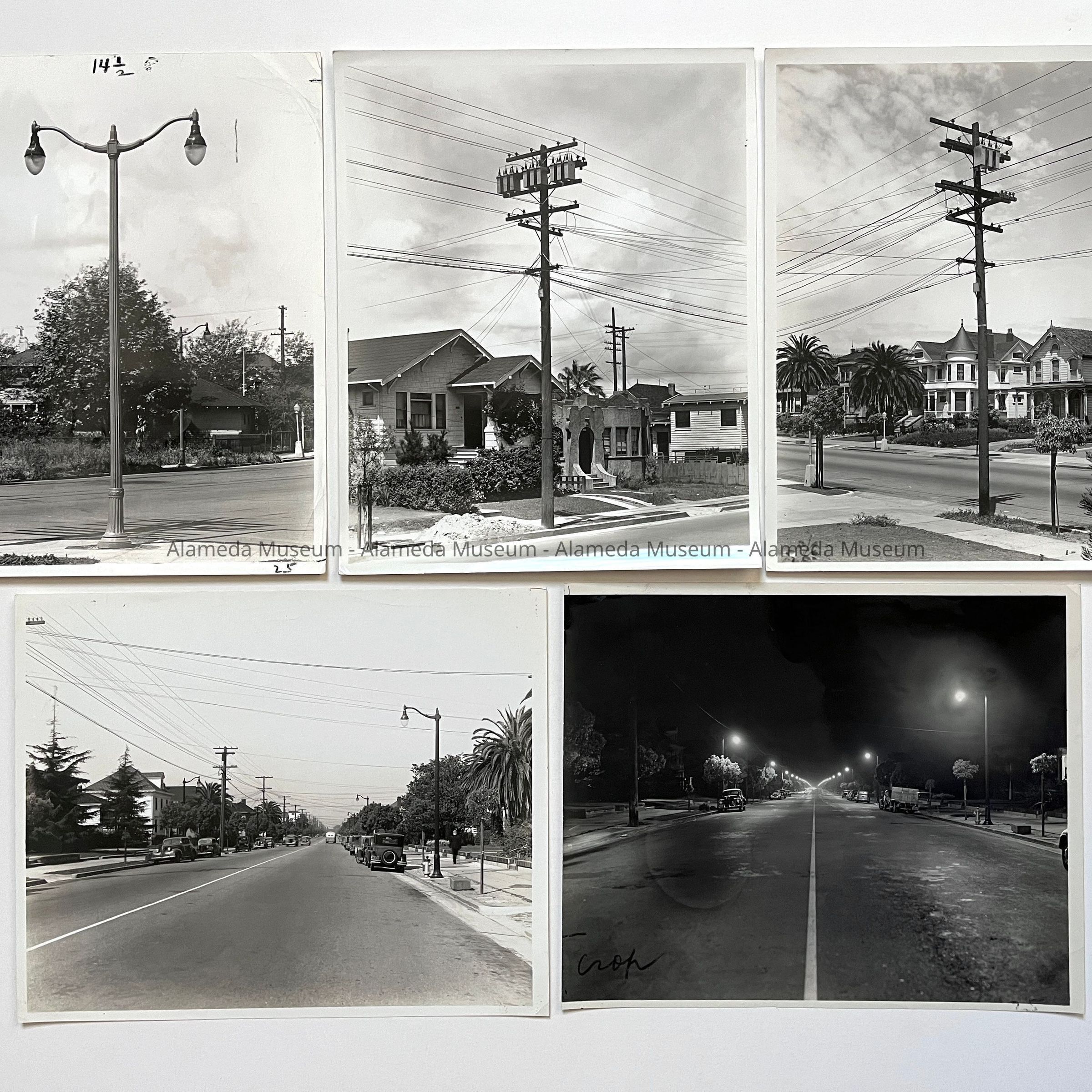 History of Object: Series of photos apparently commissioned by the Alameda Bureau of Electricity to illustrate its lighting fixtures and power poles: a) light standard; b) power pole; c) power pole; d) power pole; e) power pole overlooking residences in background; f) power pole on 2200 block of Santa Clara Ave.; g) light standards along the same block; h) night view of Santa Clara Ave. showing the illuminated pendant-type standards.
