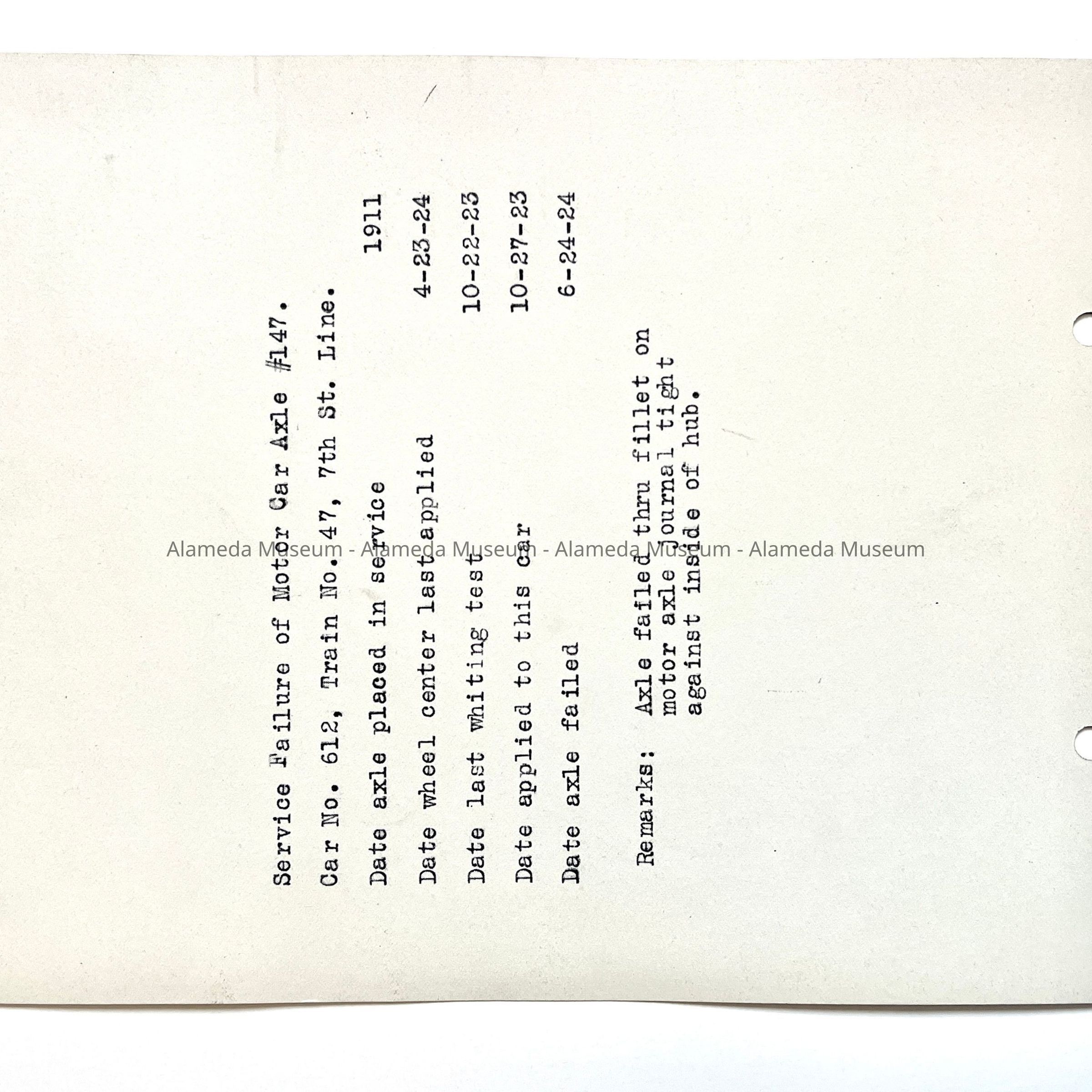 SERVICE FAILURE OF MOTOR CAR AXLE #147, West Alameda Shops, Southern Pacific Railroad Company, Alameda, California, 1924.