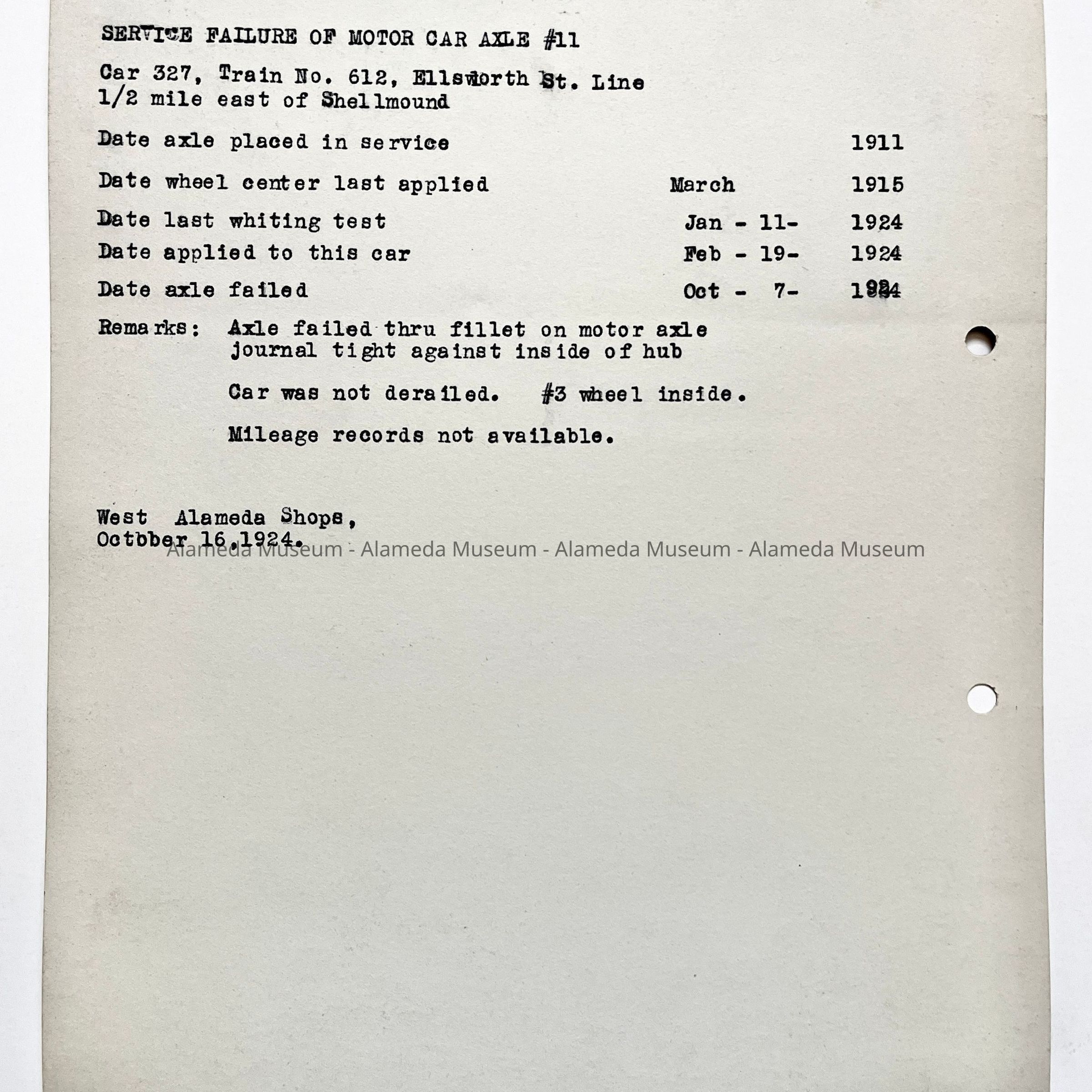 Service failure of motor car axle #11, Southern Pacific Railroad Company, West Alameda Shops, Alameda, California; October 16, 1924.