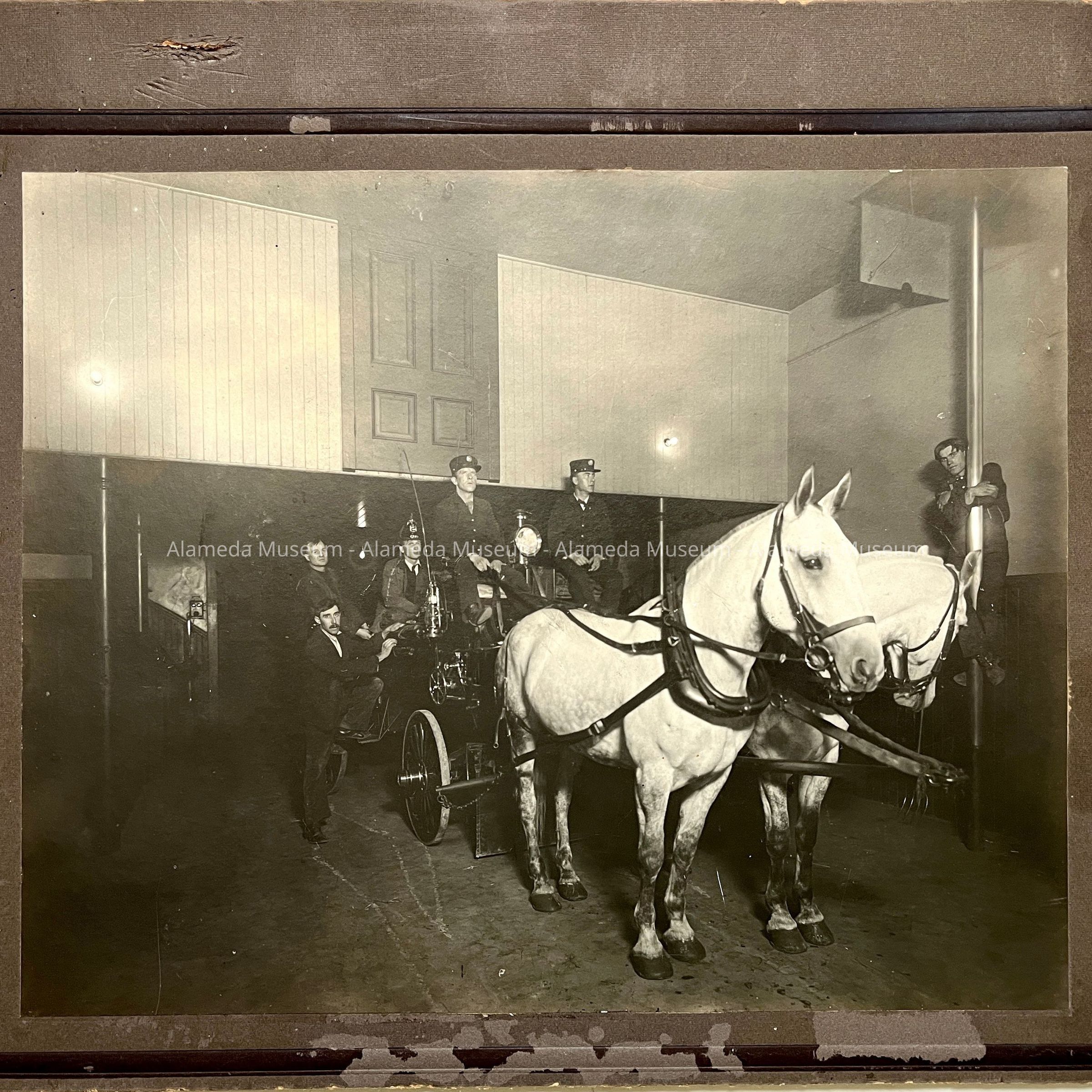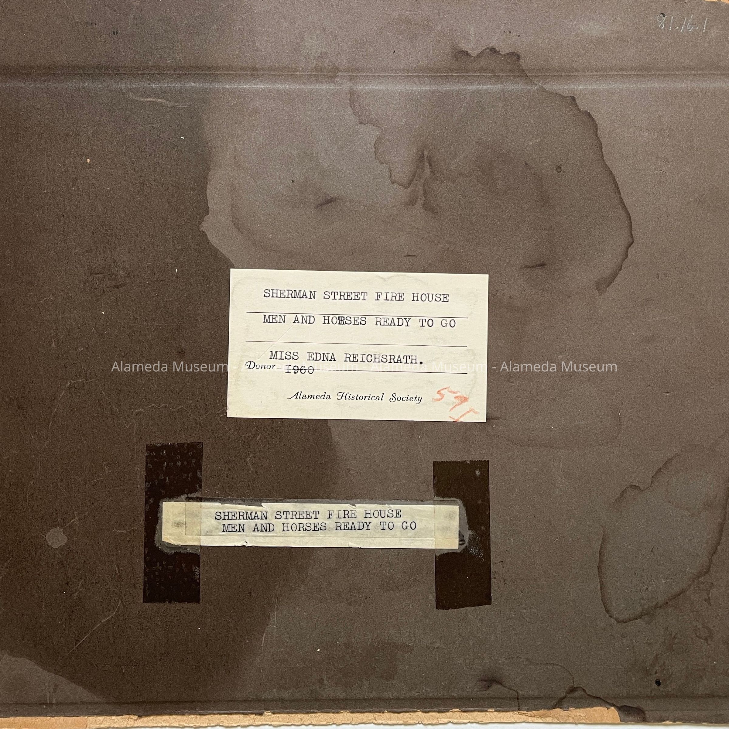 History of Object: Sherman Street Fire House. Men and horses ready to go.