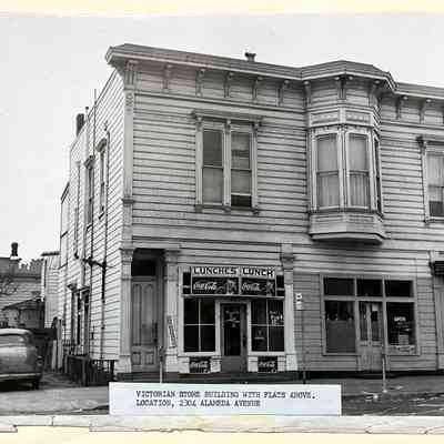 Photograph depicting the side view of the two-story commercial building that stood at 2304 Alameda Avenue, at the corner of Oak St. The building was destroyed by fire around 1990.