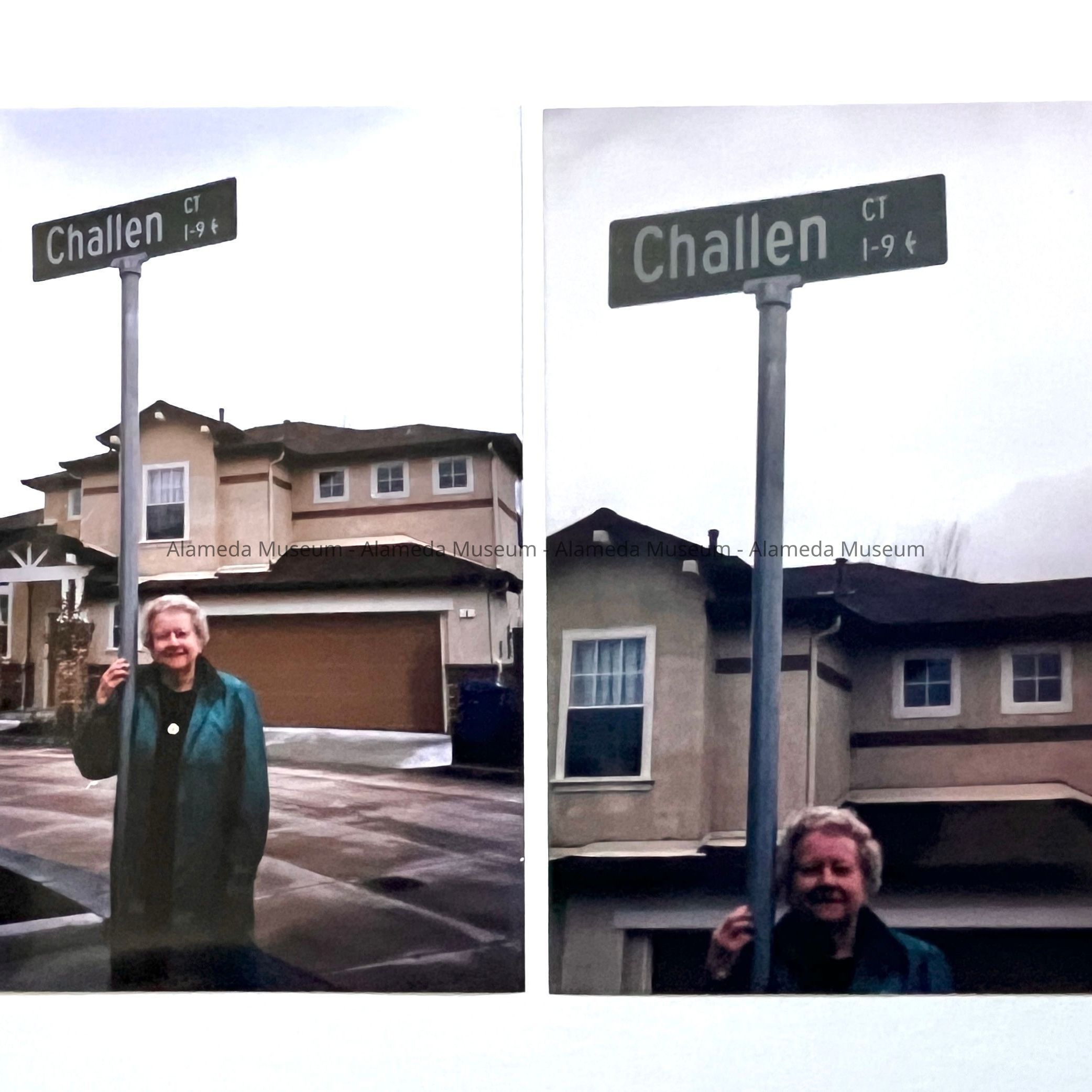 DR. CHALLEN IS POSING WITH THE STREET SIGN OF CHALLEN COURT, NAMED AFTER HER.