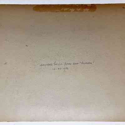 Description: Glossy black/white photo mounted on charcoal paperboard. Photographer unknown. A descriptive typed segment is incorporated into the negative. An additional white description label in black printing is glued to the bottom margin. An old green cataloging label is affixed to the upper left corner of the image.