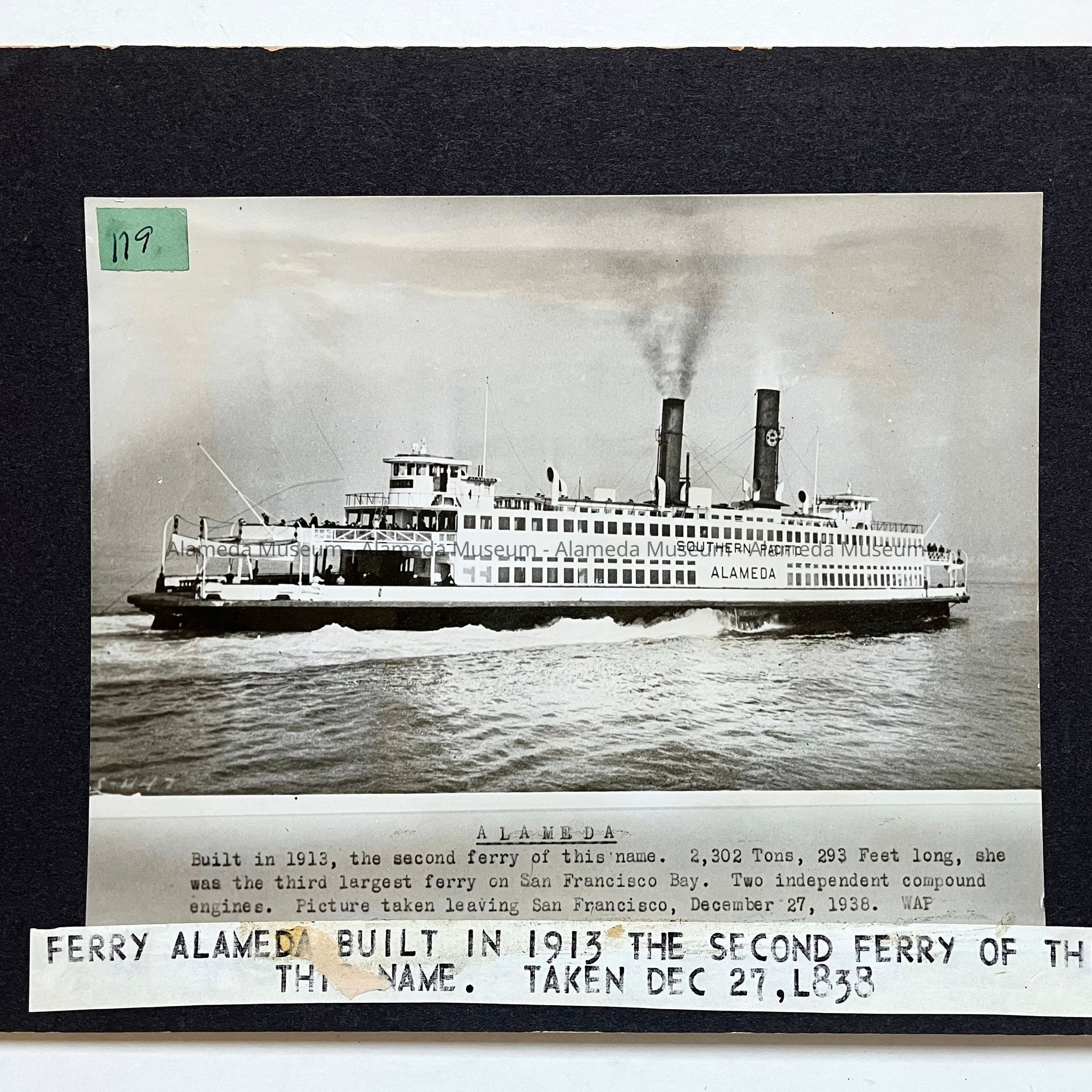 History of Object: Southern Pacific ferry "Alameda" shown leaving San Francisco on Dec. 27, 1938. It was the third largest ferry boat on San Francisco Bay.
