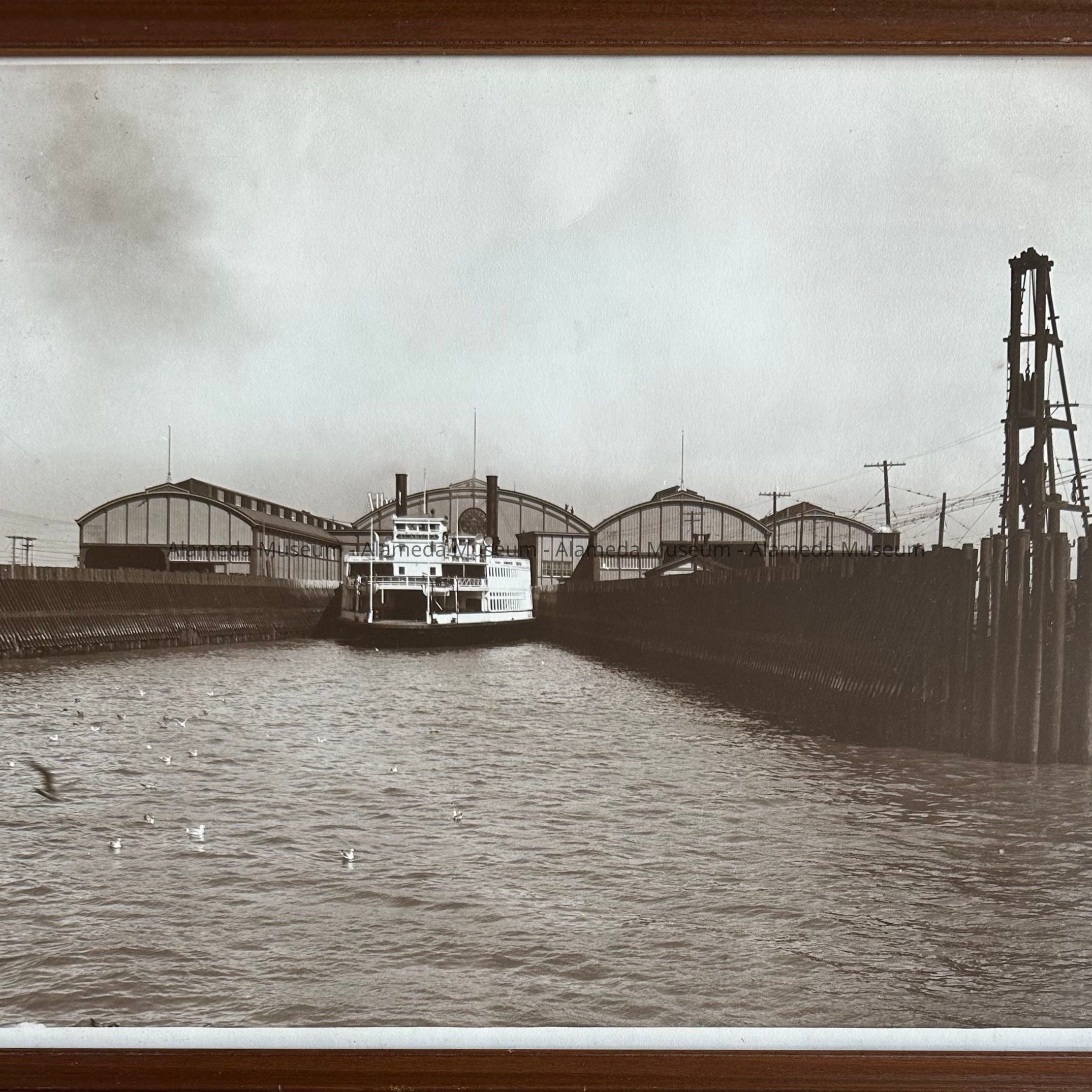 History of Object: Enlarged photograph of the Southern Pacific Ferryboat, “Alameda”, moored at the Alameda Mole. Photograph from the Southern Pacific collection.